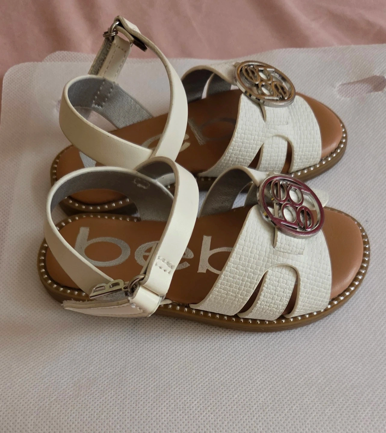 Bebe white sandals with a decorative silver emblem on the strap. Features an adjustable ankle strap for a secure fit. Classic design with a touch of sparkle.