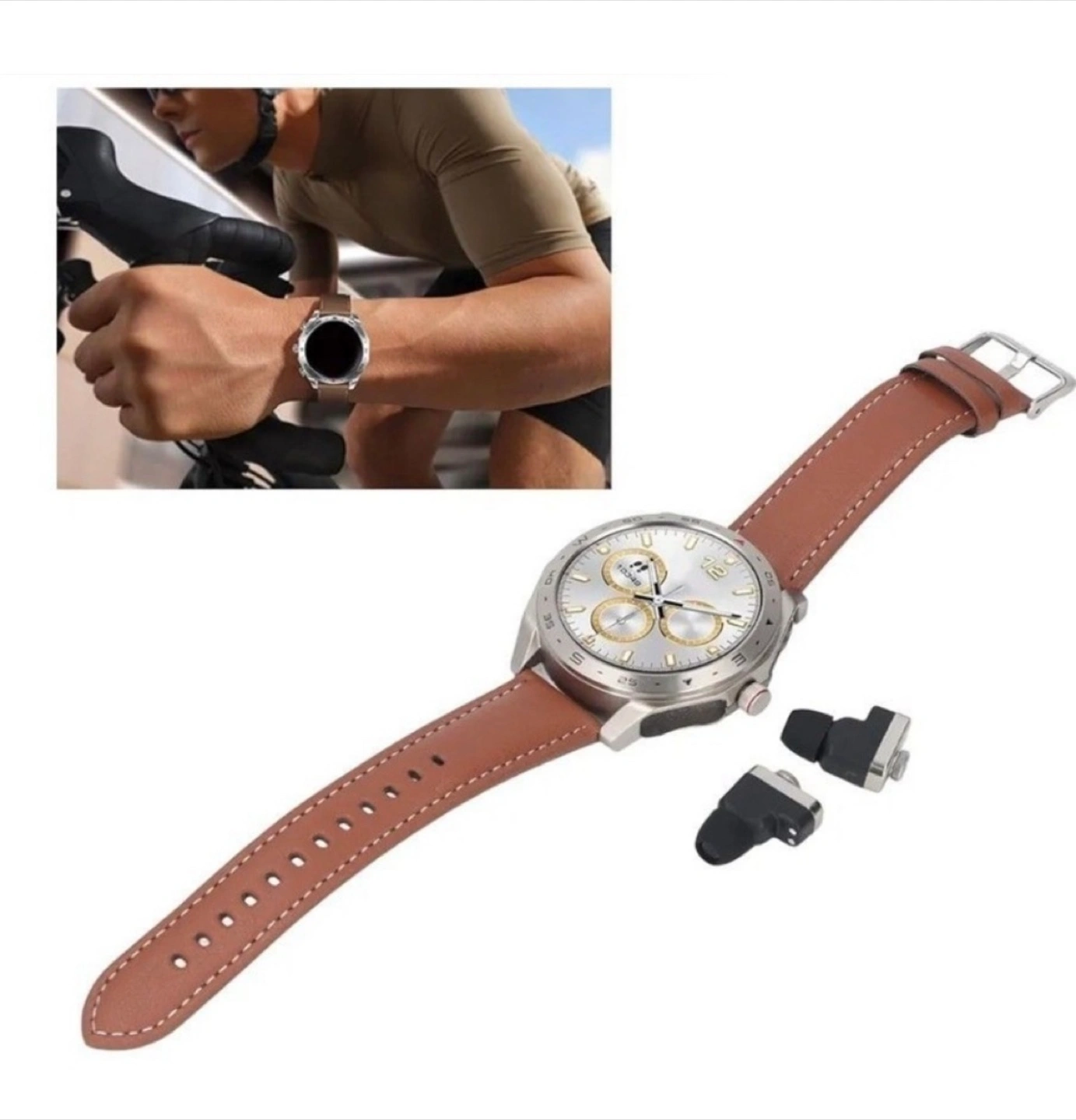 Selling a Huawei Watch GT 2 Pro with a brown leather strap. It's in new and ready for a new owner! It comes with the charging components.
