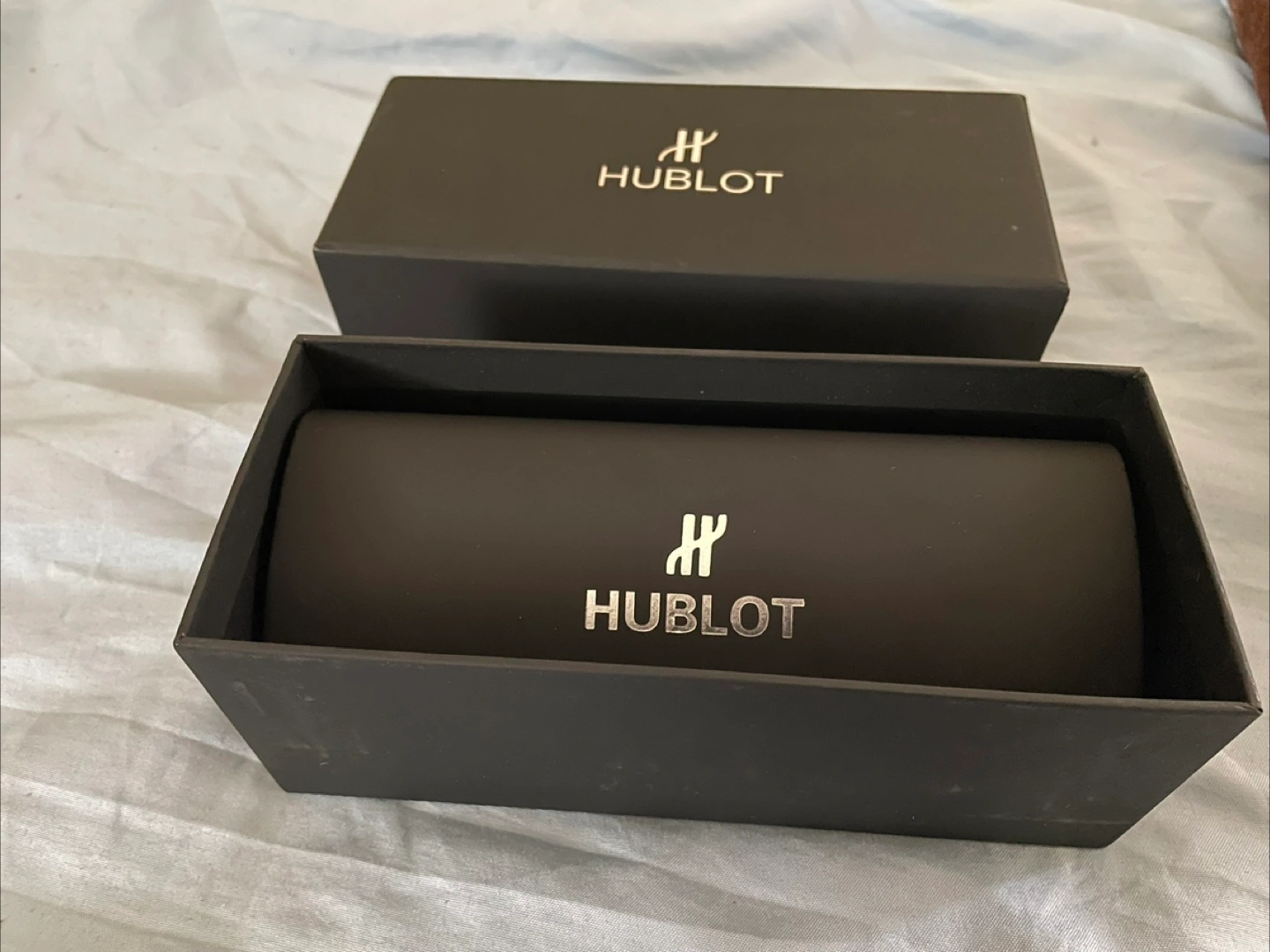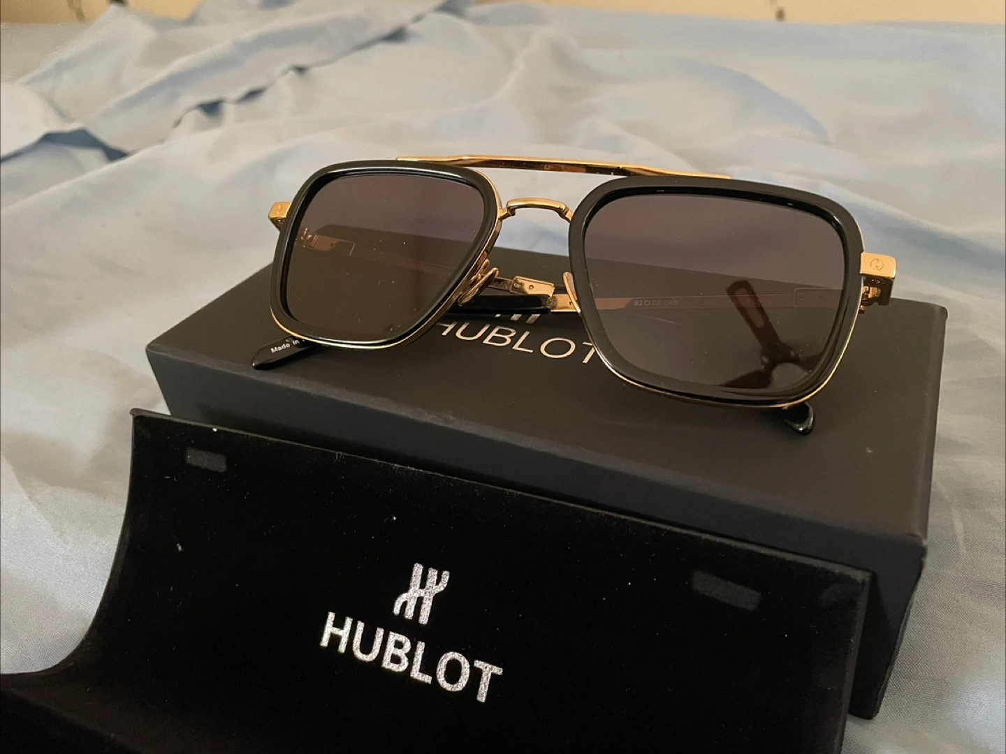 Selling a pair of Hublot sunglasses! They feature a stylish black and gold design and come with the original box and case