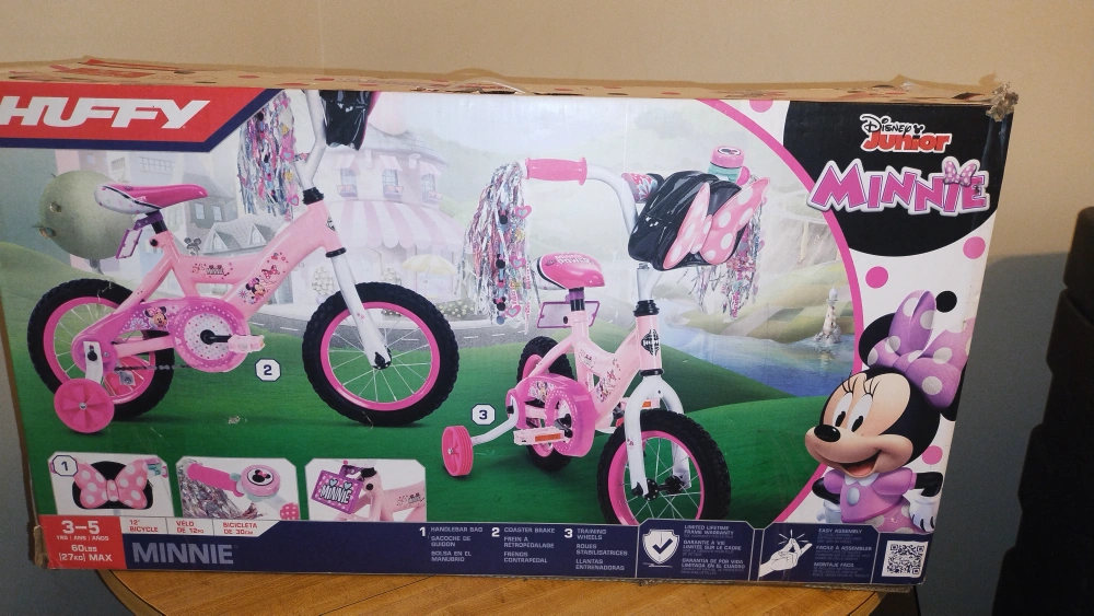 Selling a Huffy Disney Junior Minnie 12" bike! It's designed for kids aged 3-5 years old and up to 60 lbs (27kg) max. It features a handlebar bag, coaster brake, and training wheels. Perfect for your little one to learn to ride!