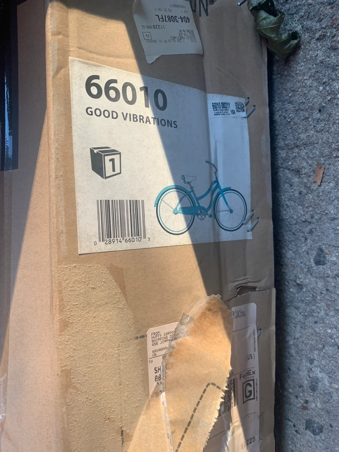 Selling a brand new Huffy Good Vibrations cruiser bike! It's still in the original box, ready for assembly and fun rides. "We Make Fun" is printed on the box, so you know it's a good time waiting to happen