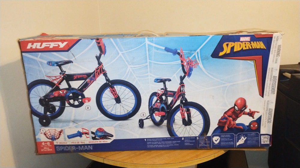 Selling a Huffy Marvel Spider-Man 16" bike! The box says it's suitable for ages 4-6. It features cool Spider-Man graphics and is sure to be a hit with any young fan of the superhero