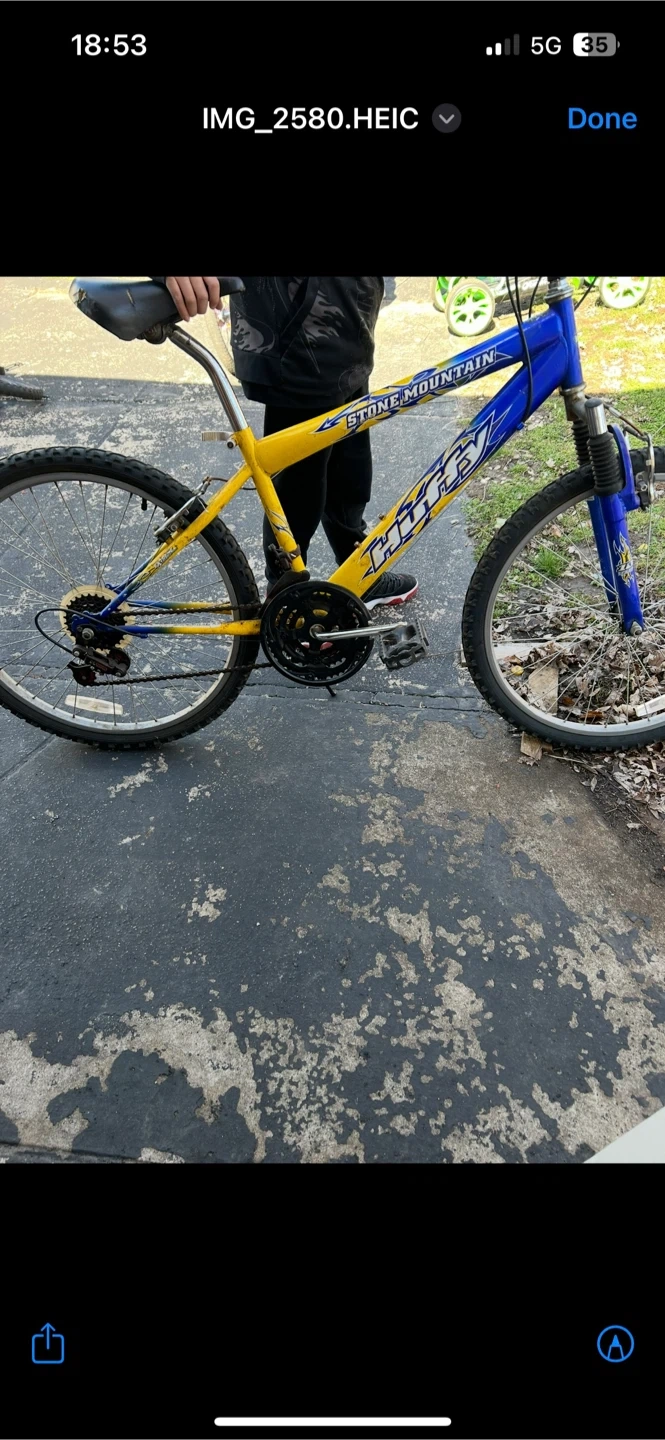 Selling a Huffy Stone Mountain bike in yellow and blue. It appears to be in used condition, ready for a new owner to enjoy!