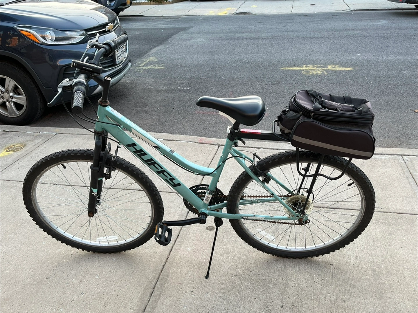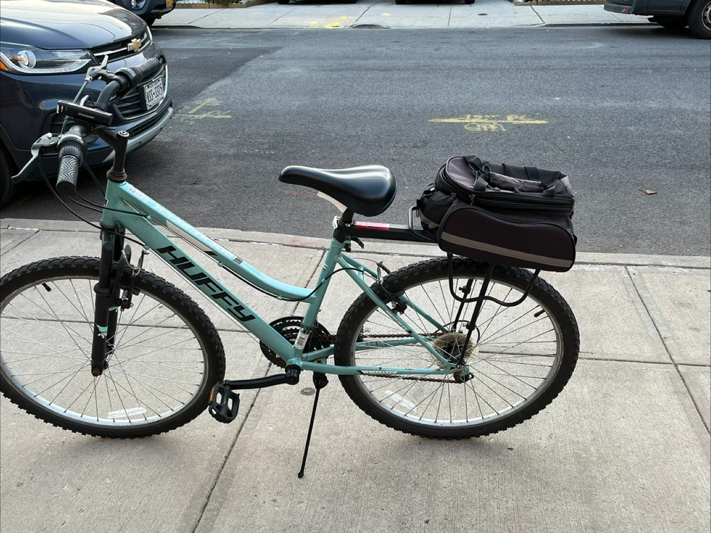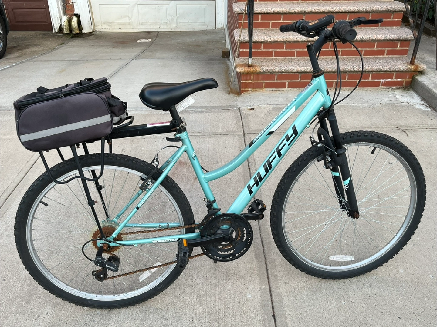 Selling a Huffy women's mountain bike in a nice light blue color. It's in good condition and ready for some outdoor adventures! It also comes with a rear rack and bag for carrying your essentials
