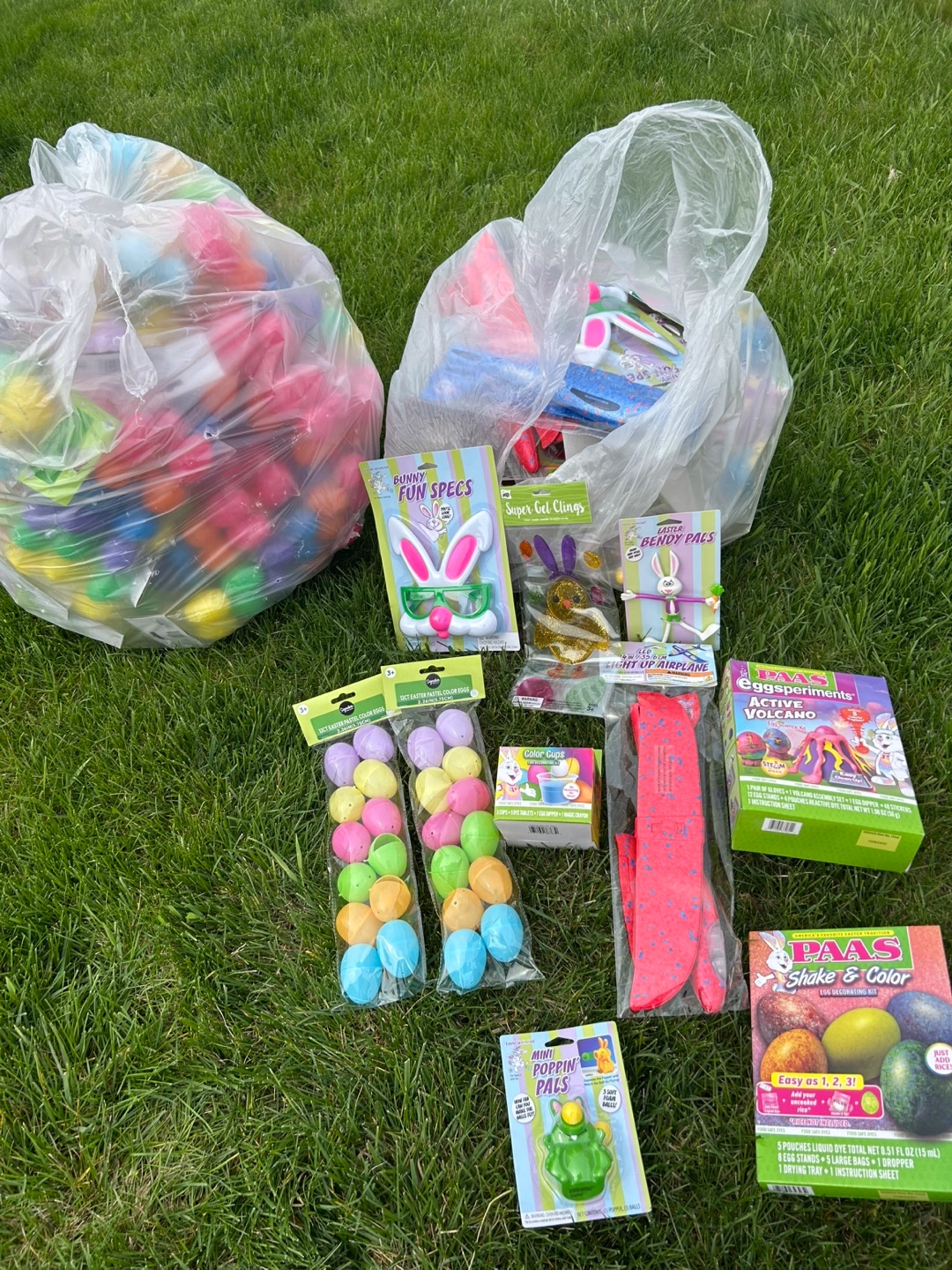 Large bags of plastic Easter eggs, various party favors, and craft supplies. Includes dye kits and other goodies. Perfect for Easter egg hunts, parties, or crafting. All new.