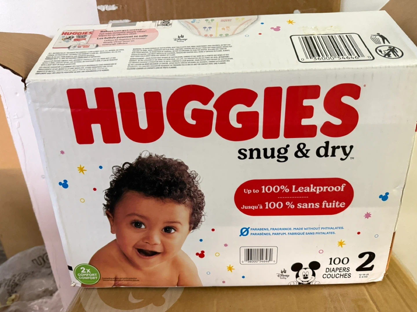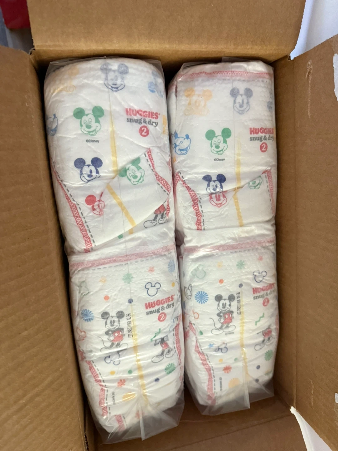 I have a box of Huggies Snug & Dry diapers, size 2, with 100 diapers in the box! They feature a Disney design with Mickey Mouse and friends. These diapers are up to 100% leakproof and are made without phthalates, parabens, or fragrance. Perfect for your little one!