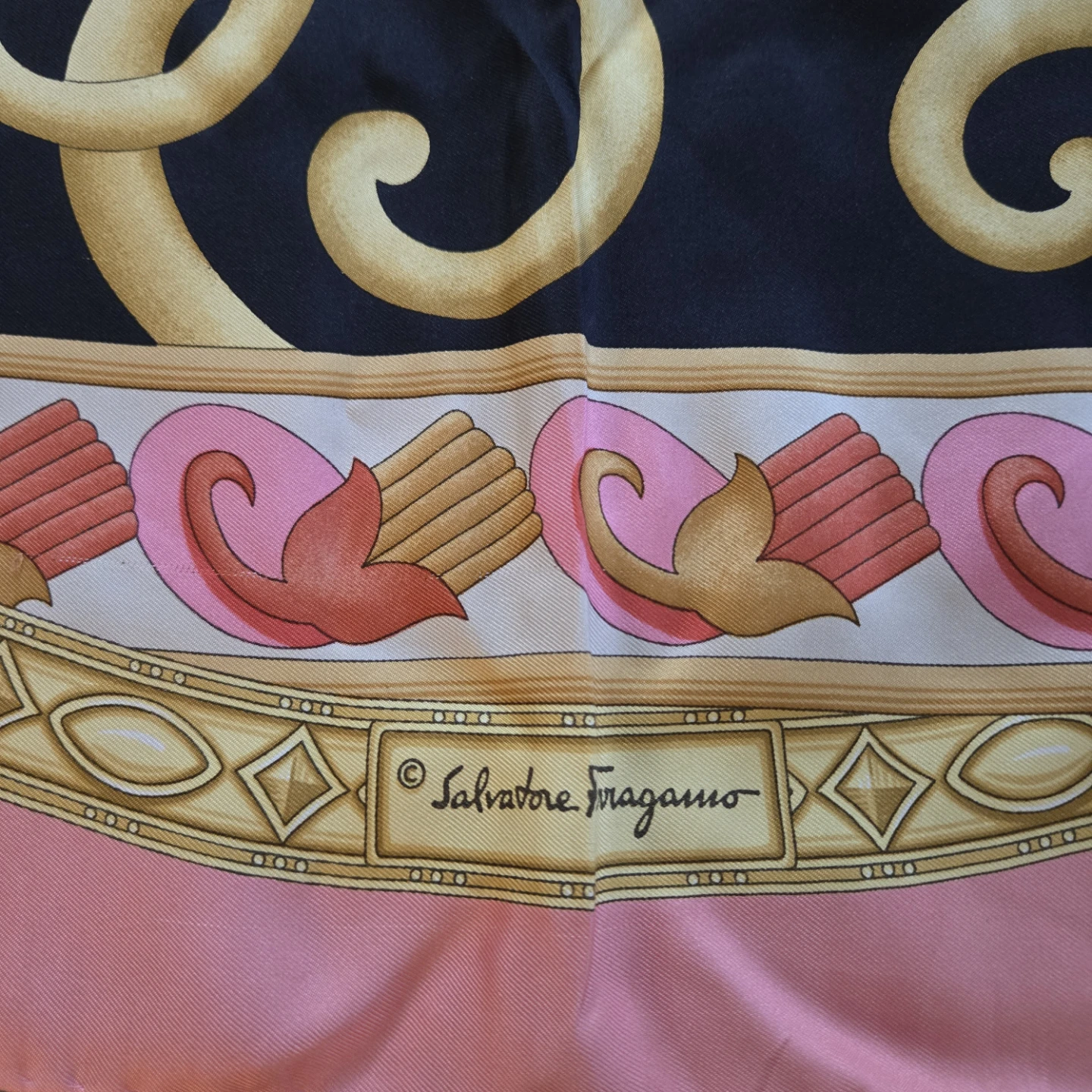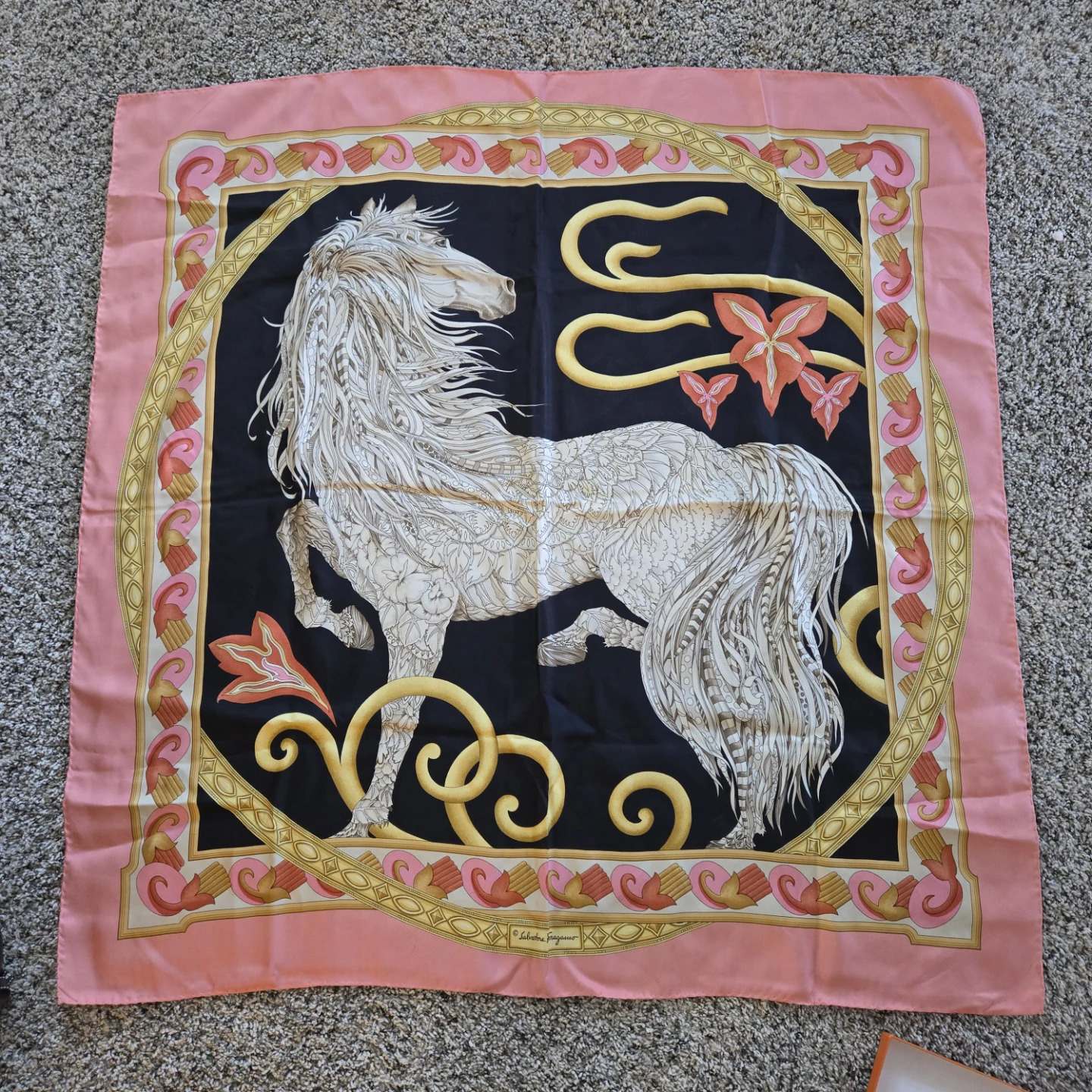 This is a Salvatore Ferragamo silk scarf with a horse motif. It features a black background with a pink border and intricate gold, red, and white detailing. The scarf is made of 100% silk. A beautiful accessory!