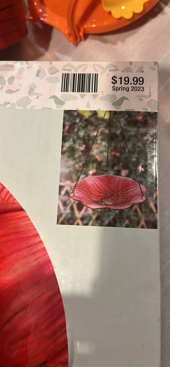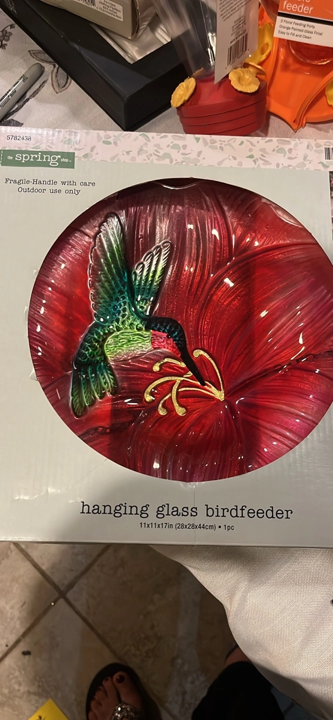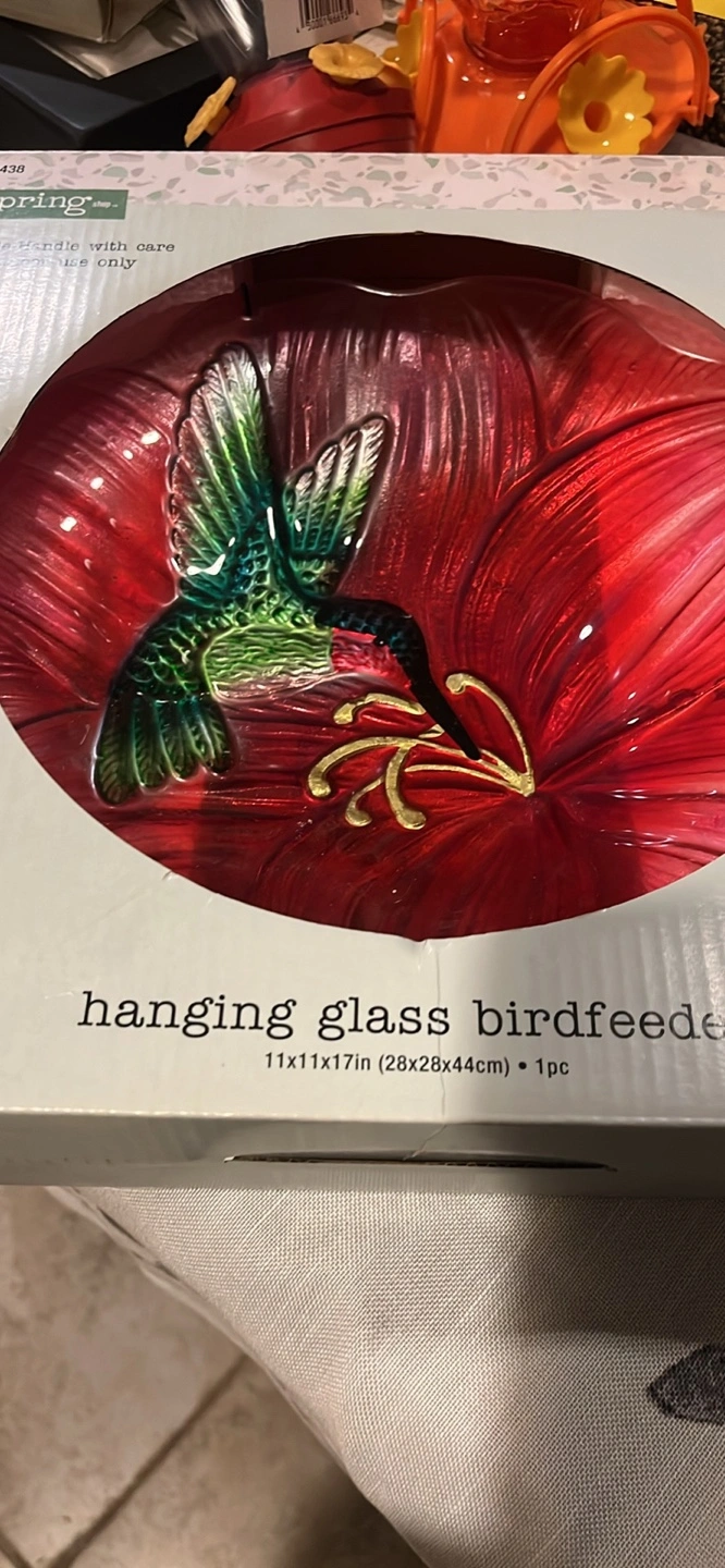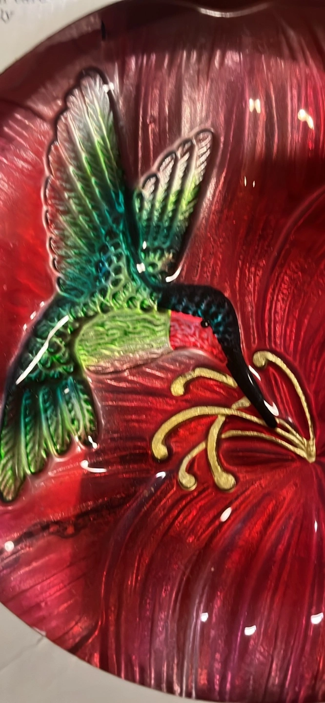 75New in box. Hanging glass bird feeder features hummingbird on a red flower. Measures 11x11x17 inches.