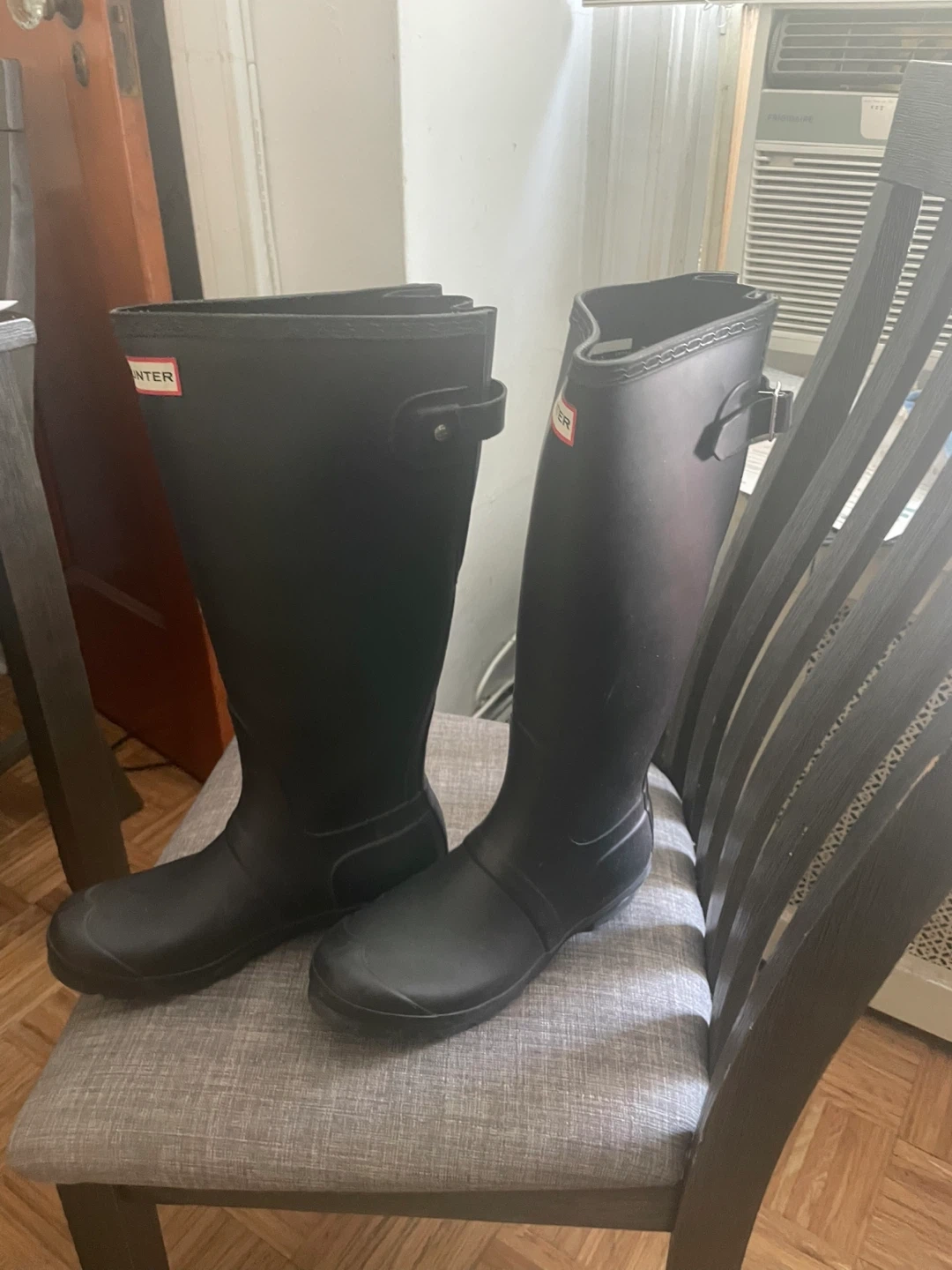 78Selling a pair of classic Hunter rain boots in black. They're in great condition and ready to keep your feet dry and stylish! Perfect for rainy days or muddy adventures