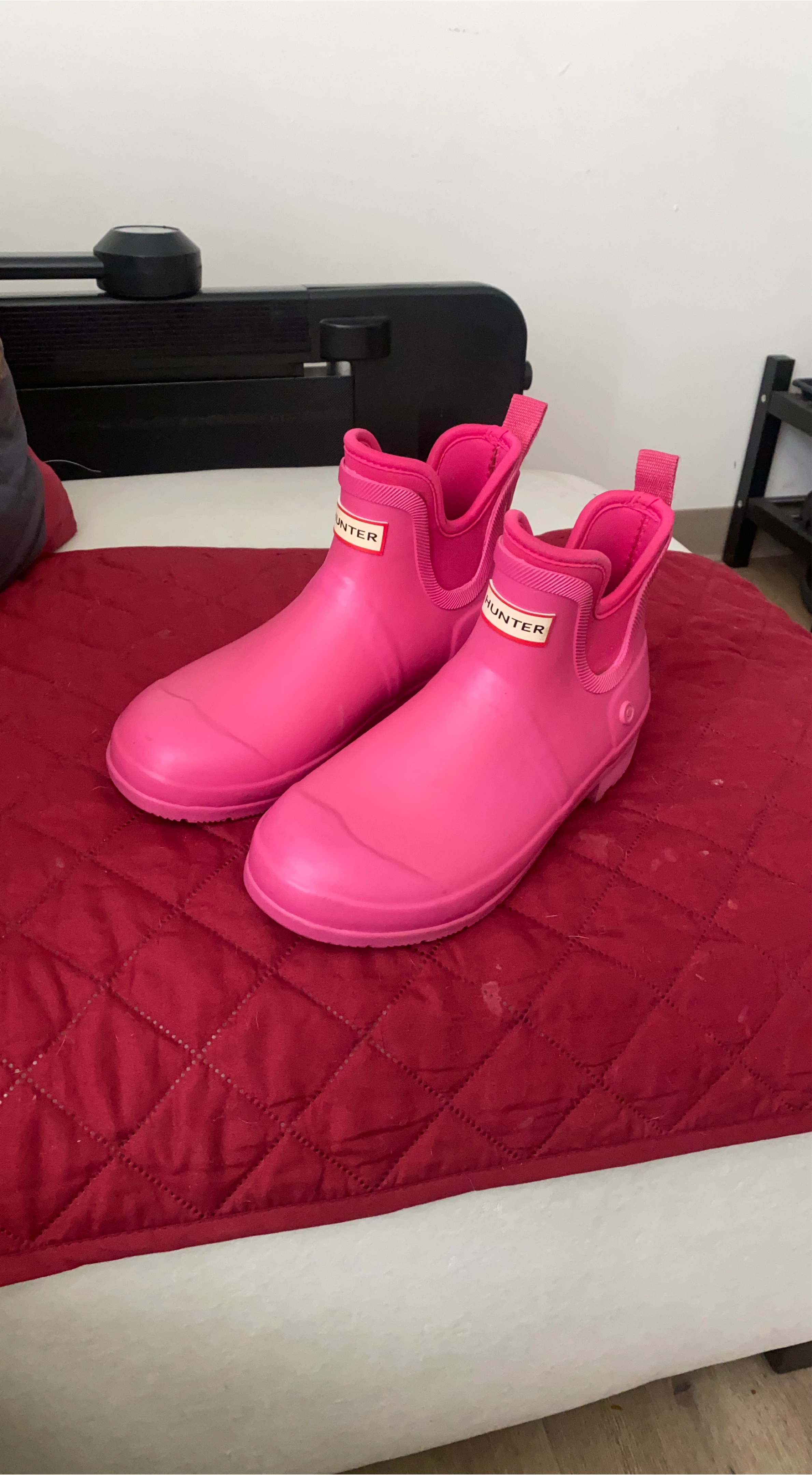 65These are a pair of Hunter ankle rain boots in a vibrant pink color. They're perfect for keeping your feet dry and stylish on rainy days!
