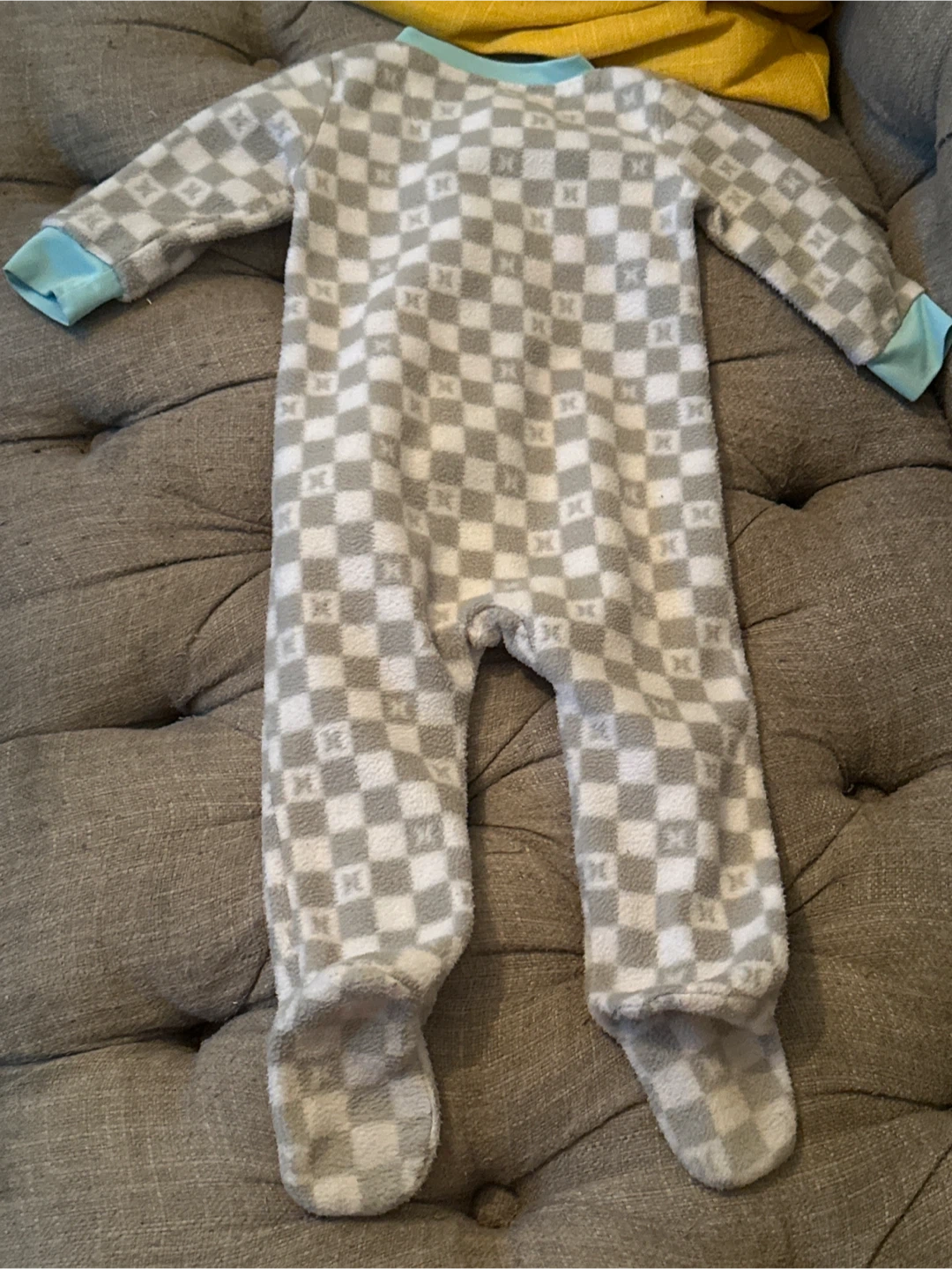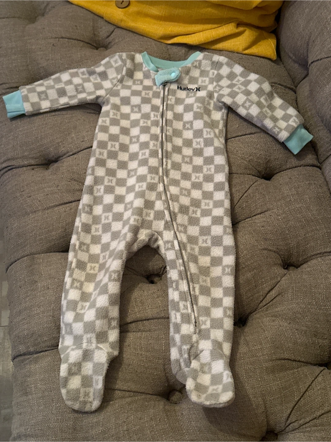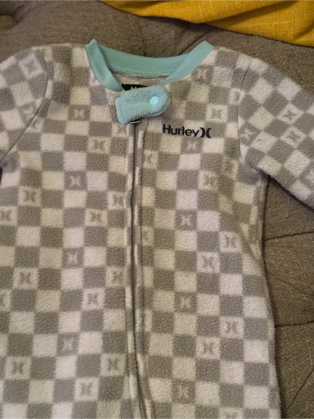 Cozy Hurley baby onesie with a cute gray and white checkered pattern! Perfect for keeping your little one warm and comfy. The onesie features a full zipper for easy changing and soft, footed design. 9M size