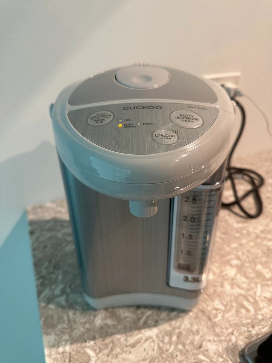 Cuckoo electric hot water dispenser: 8.7"L x 7"W x 12.4"H. Holds 3.3L