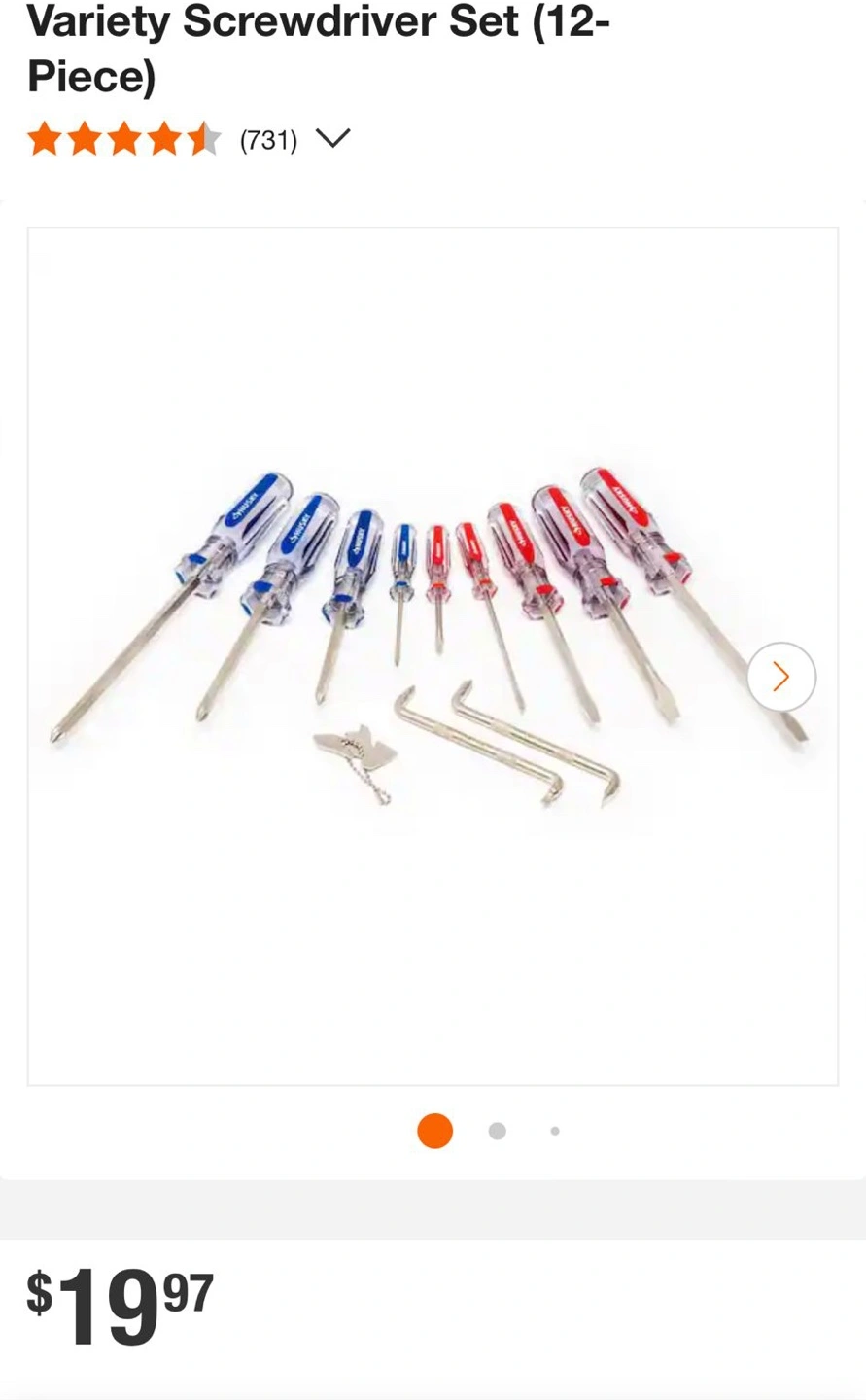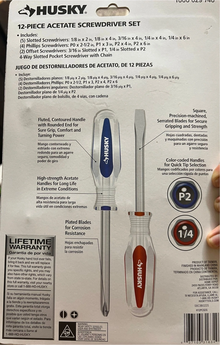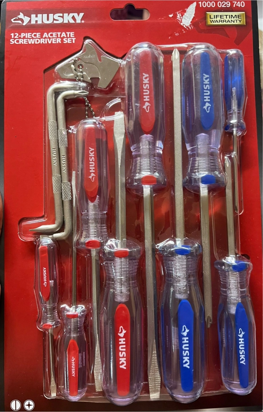 77I'm selling a brand new Husky 12-piece acetate screwdriver set! This set includes slotted and Phillips screwdrivers in various sizes, as well as offset screwdrivers and a pocket screwdriver with a chain. The screwdrivers feature fluted, contoured handles for a sure grip and color-coded handles for quick tip selection. Originally bought for $19.97