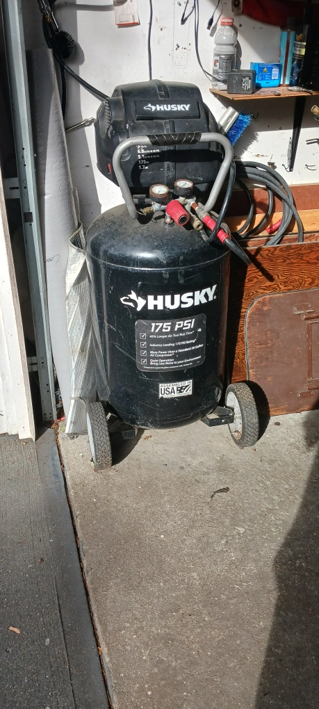 Selling a Husky 175 PSI air compressor. It shows some signs of use, but it's still in good working condition. It's black and has wheels for easy portability.