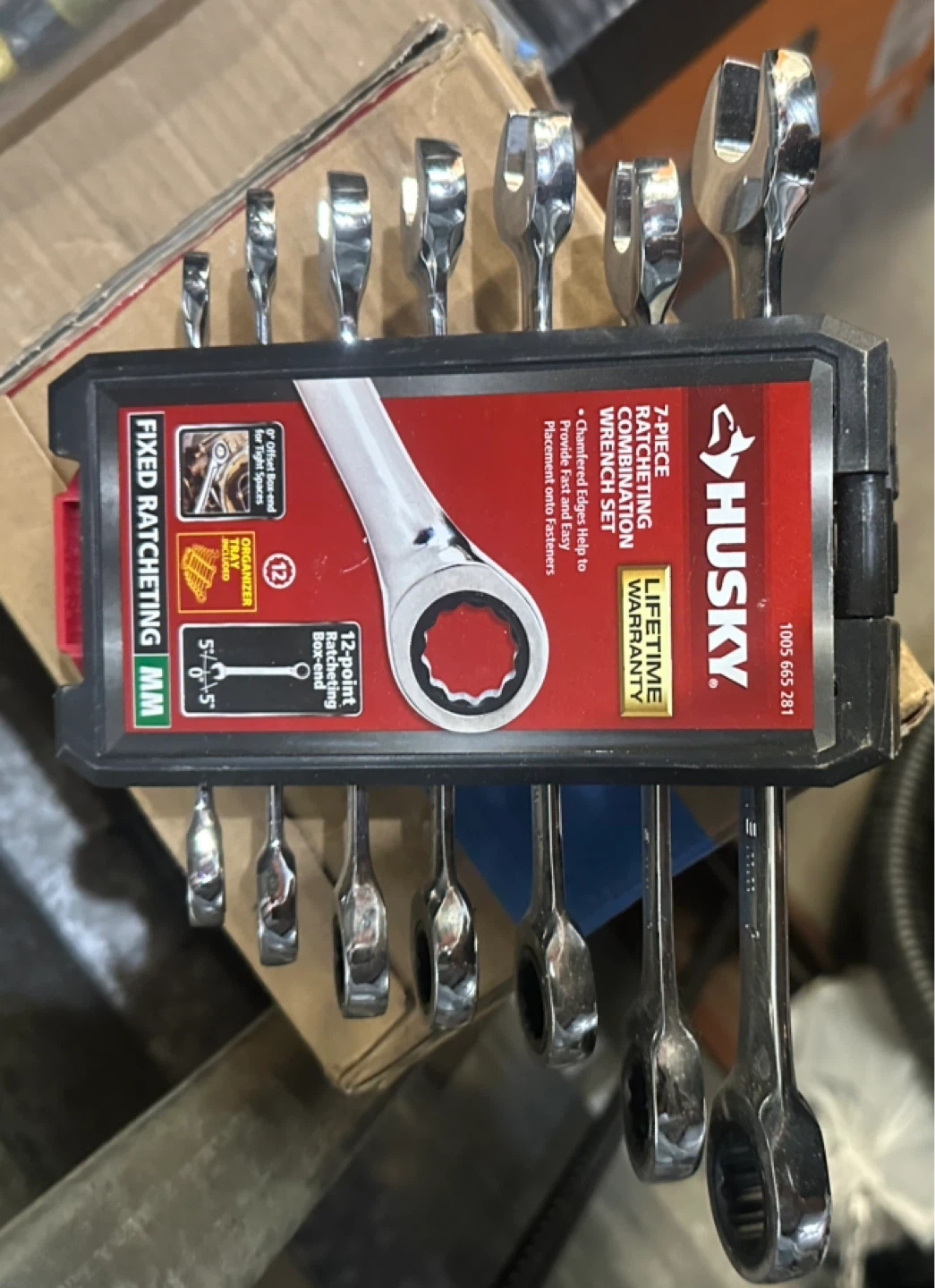65Selling a Husky 7-piece ratcheting combination wrench set! It features a chamfered edge to help guide the wrench onto fasteners and has a 12-point box-end
