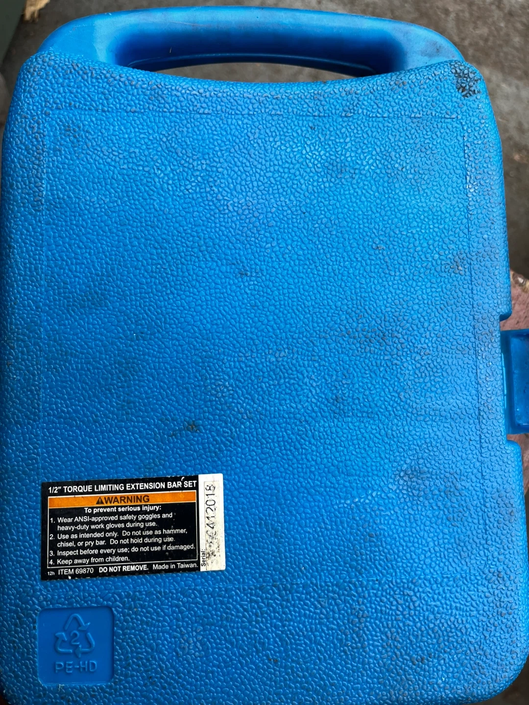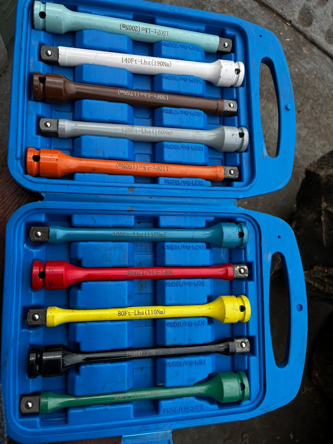 Set includes various torque limiting extension bars. Bars are color-coded for easy identification. Includes 1/2" drive extensions ranging from 35ft-lbs to 150ft-lbs. Made in Taiwan.