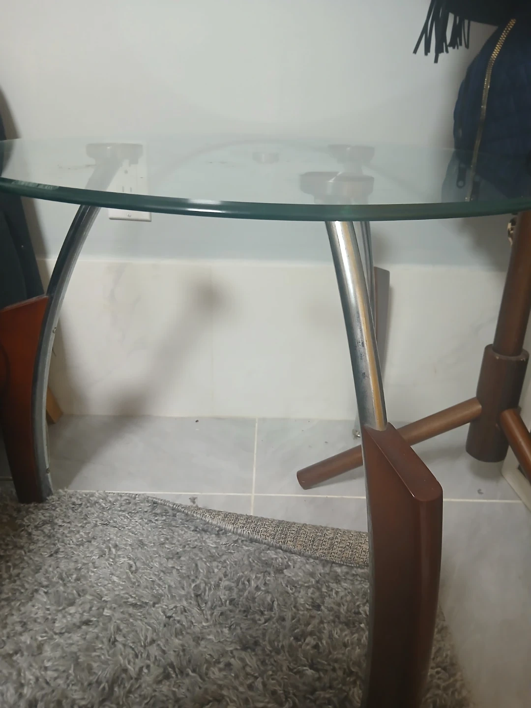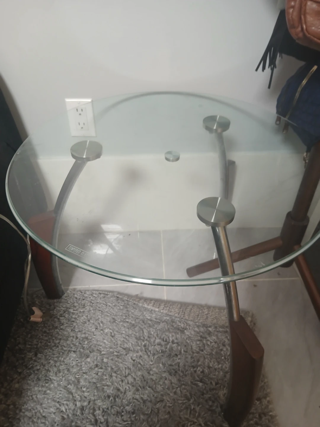 This accent table features a clear glass top with a smooth, round edge. Its unique base is made of curved metal legs with wood accents. It's a stylish piece for any room!