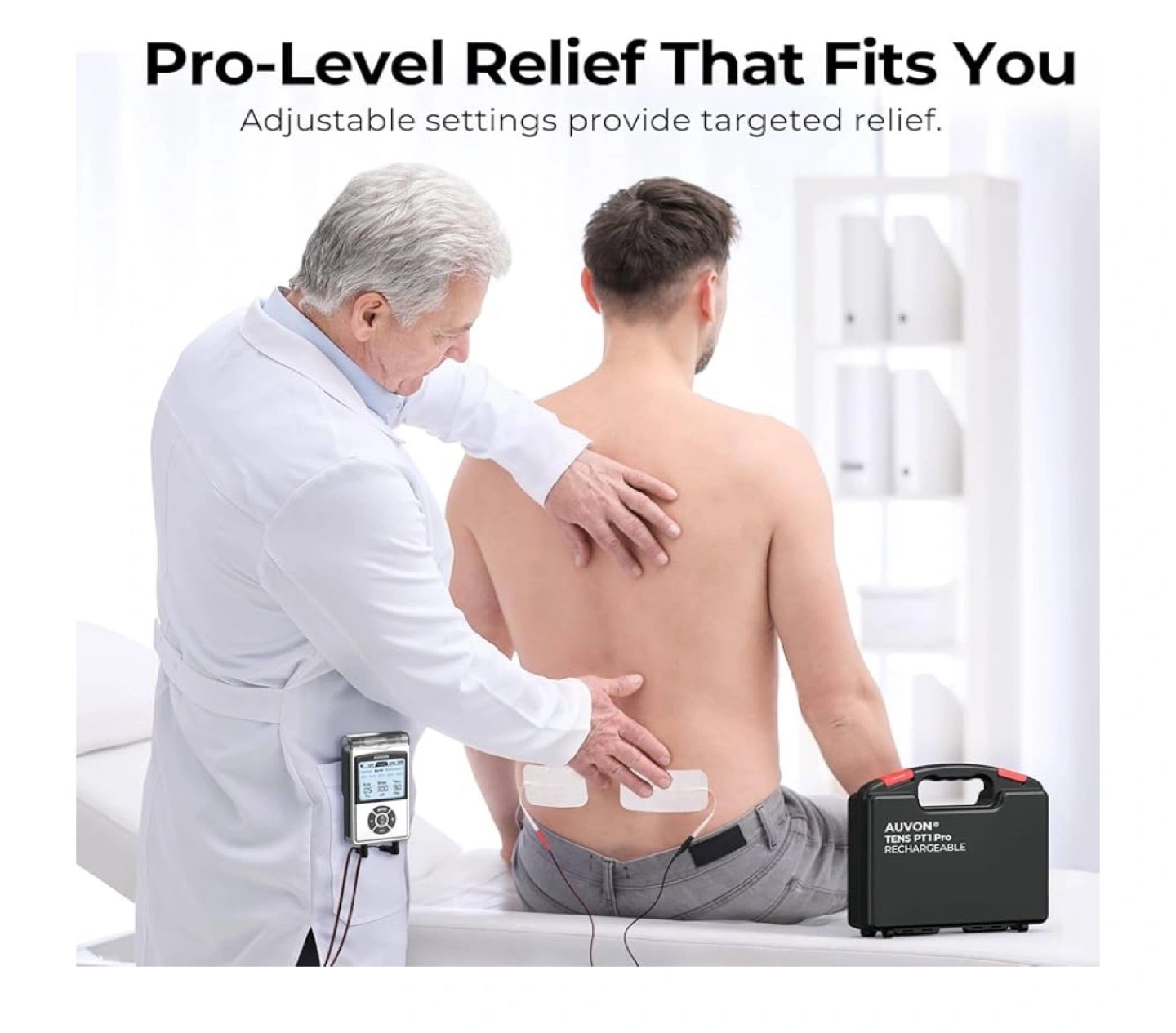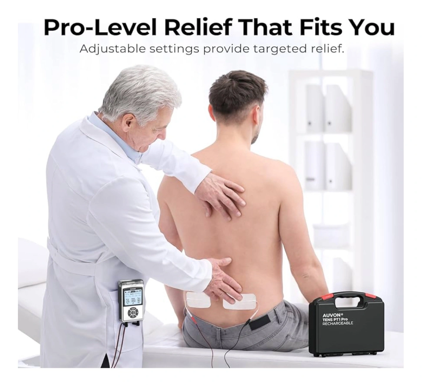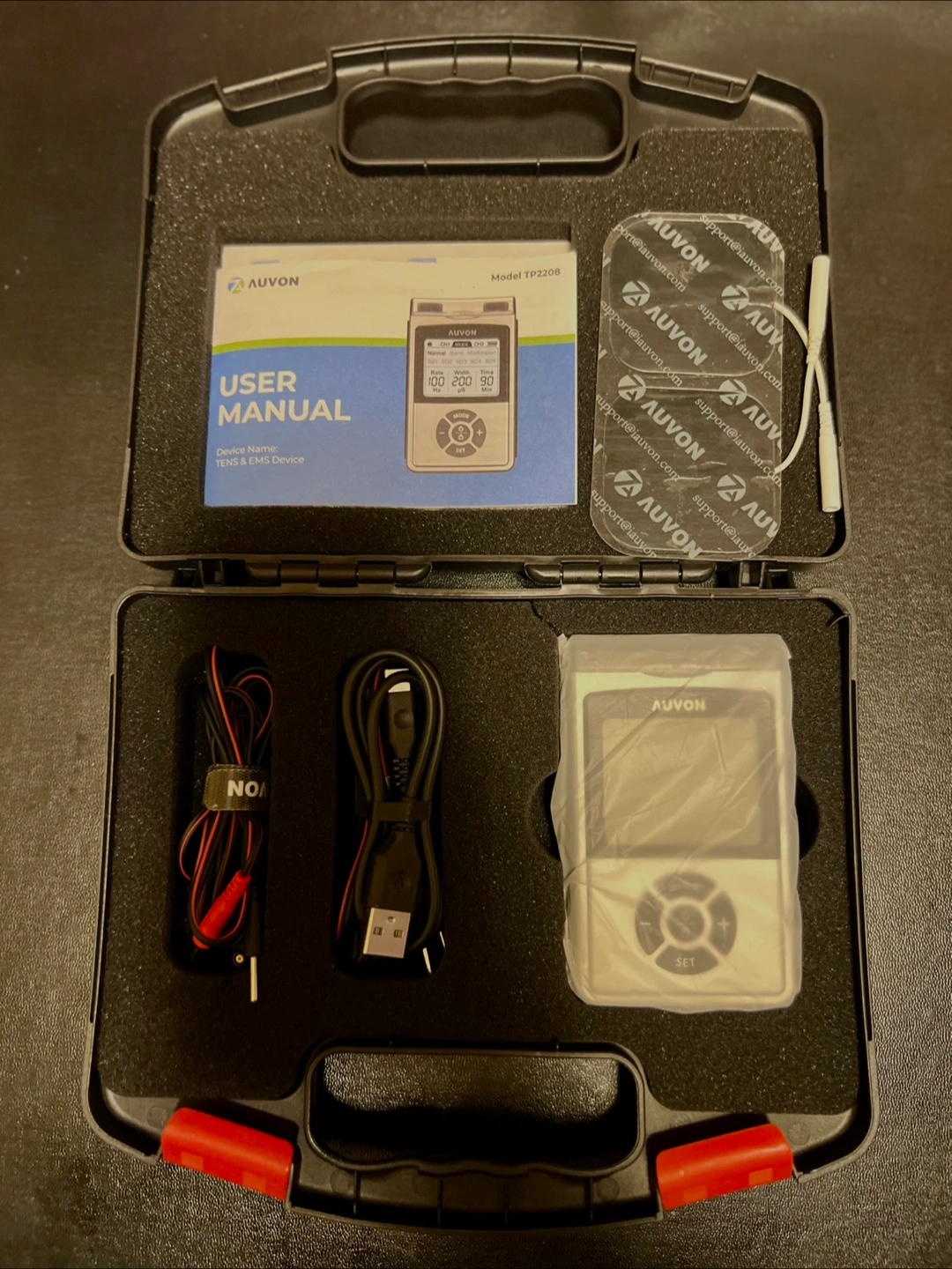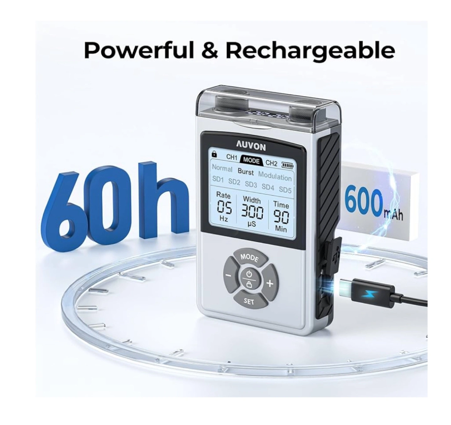I'm selling an Auvon TENS & EMS Unit TP3208. It's rechargeable and comes with a user manual. It also includes the necessary components for use. This device is a safe, non-invasive, and drug-free method for pain relief. It provides adjustable settings for targeted relief