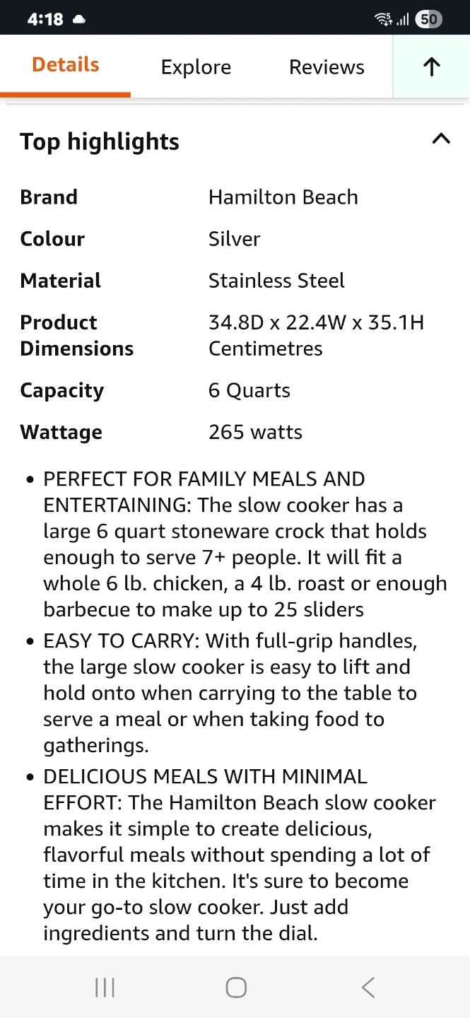 Hamilton Beach slow cooker. It has a 6-quart capacity, perfect for family meals. The dimensions are 34.8D x 22.4W x 35.1H centimetres. It's made of stainless steel and is silver in colour. It's easy to carry with full-grip handles and makes delicious meals with minimal effort!