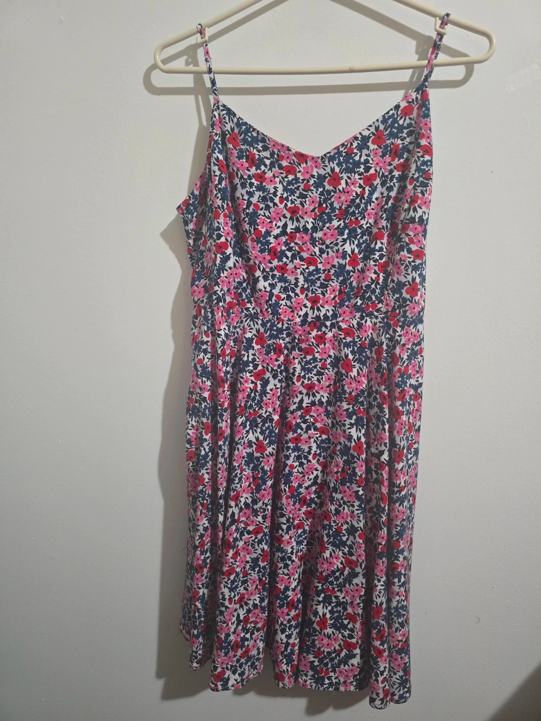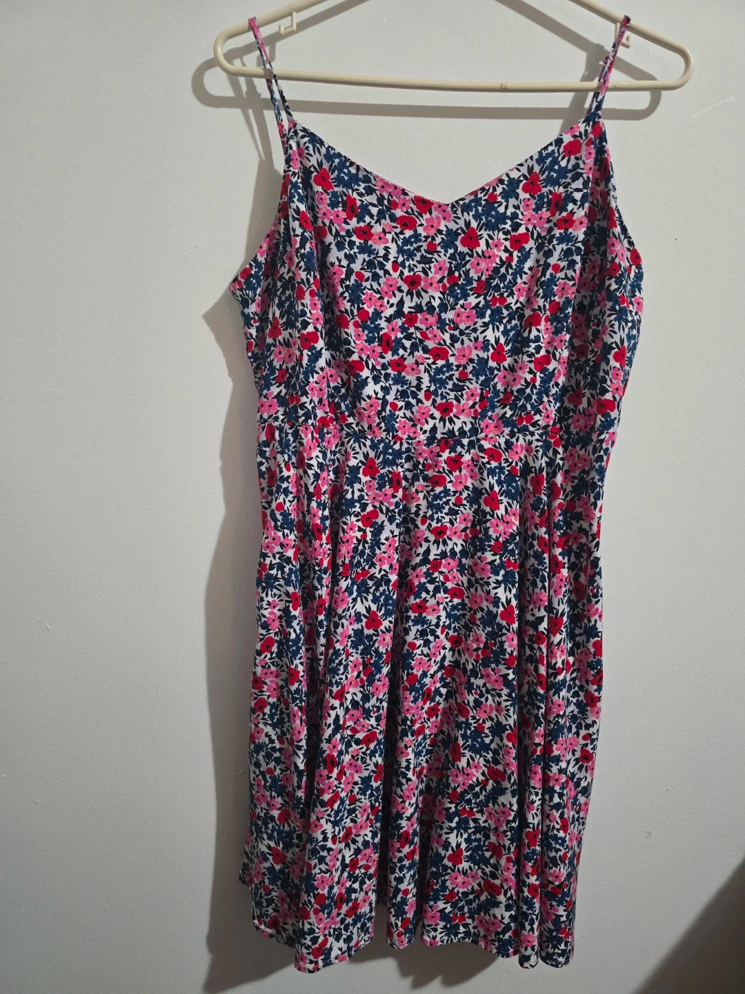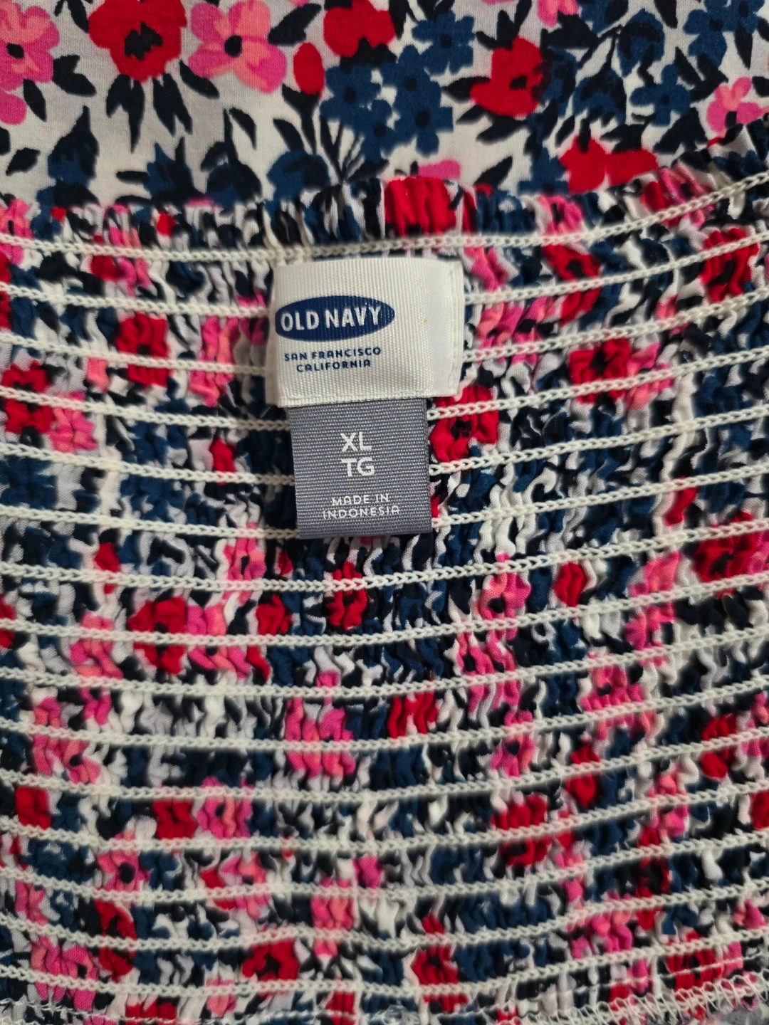 This Old Navy cami dress features a vibrant floral print with a smocked bodice. It's a size XL with adjustable spaghetti straps. Perfect for warm weather! Made in Indonesia.