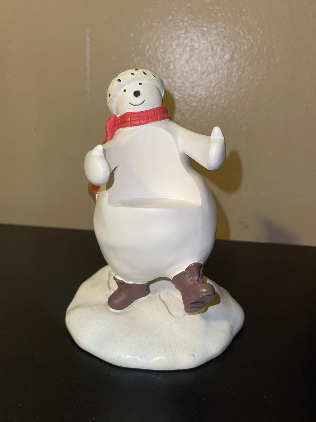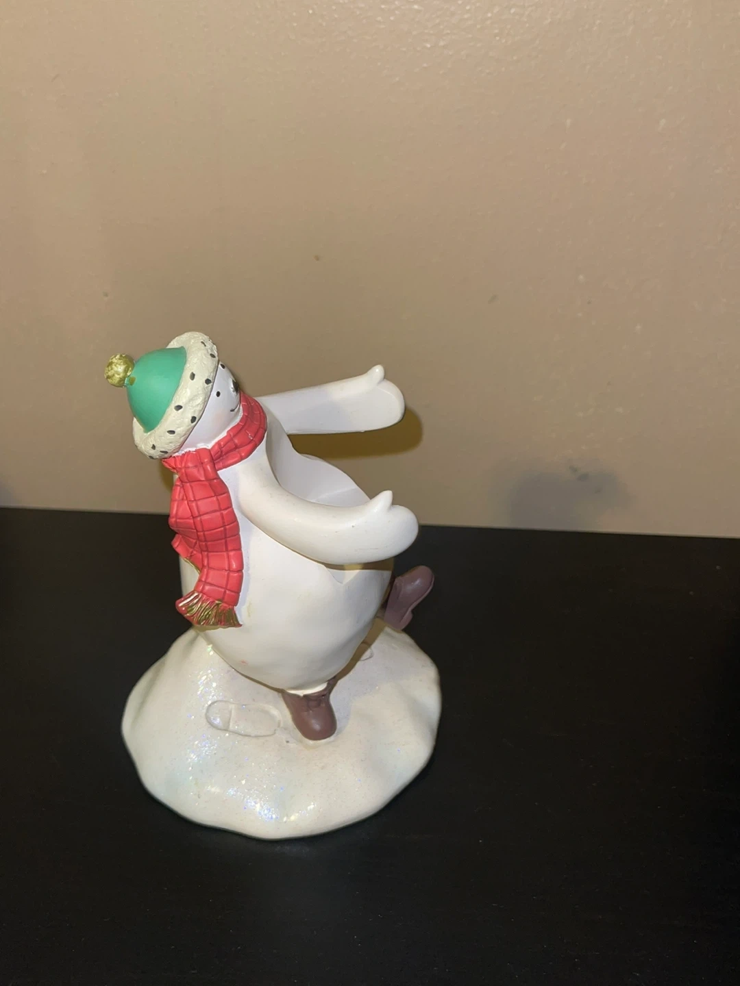This decorative snowman figurine features a red scarf and a green hat. It's made of painted ceramic material. It sits on a sparkly white base. Perfect for adding a festive touch to your holiday decor!