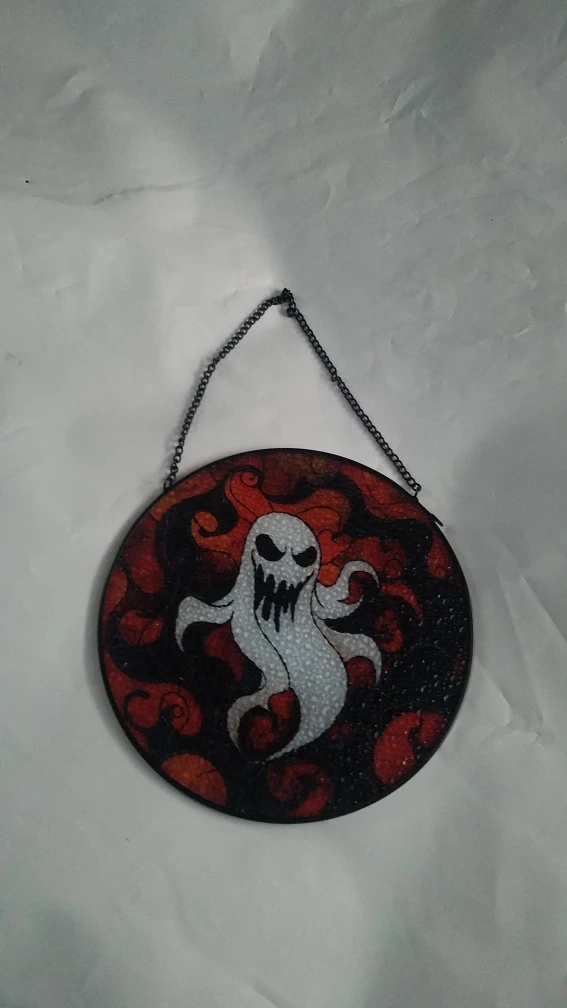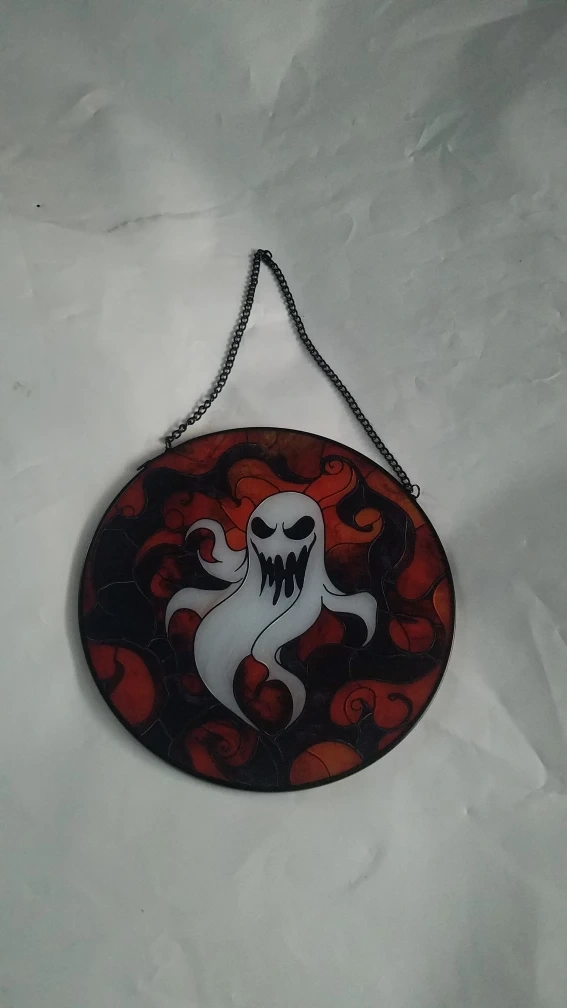 Round stained glass suncatcher featuring a spooky ghost with an orange and black swirling background. It includes a metal chain for hanging. Perfect for adding some Halloween spirit to your home!