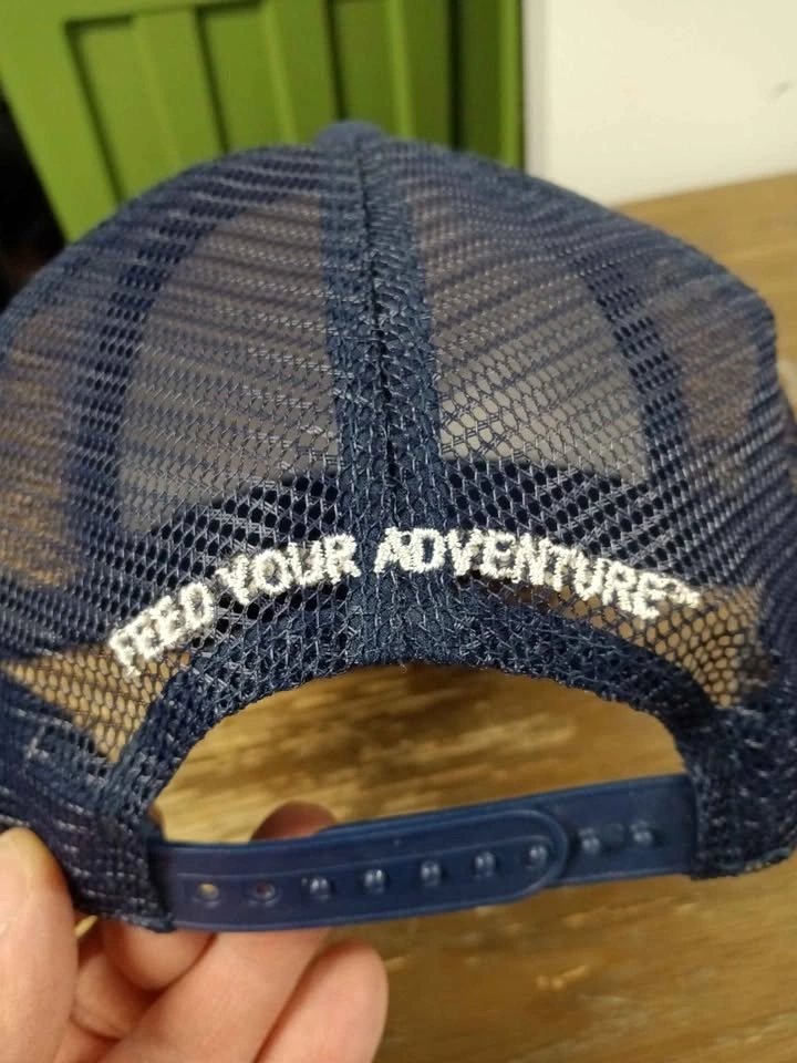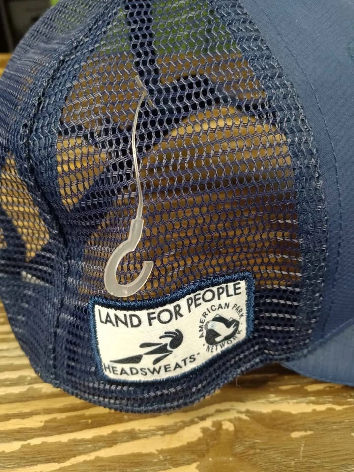 New navy blue performance trucker hat with a breathable mesh back and adjustable snapback closure. Features embroidered Trail Magic and Clif Bar logos on the front, a Land For People patch on the side, and "Feed Your Adventure" embroidery on the back. Made of lightweight polyester material, designed for active use.