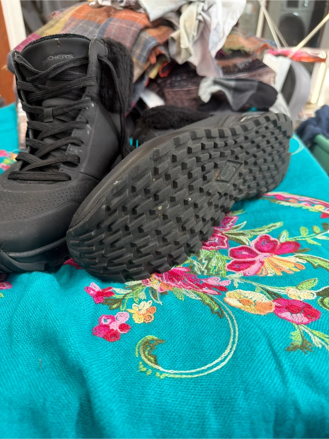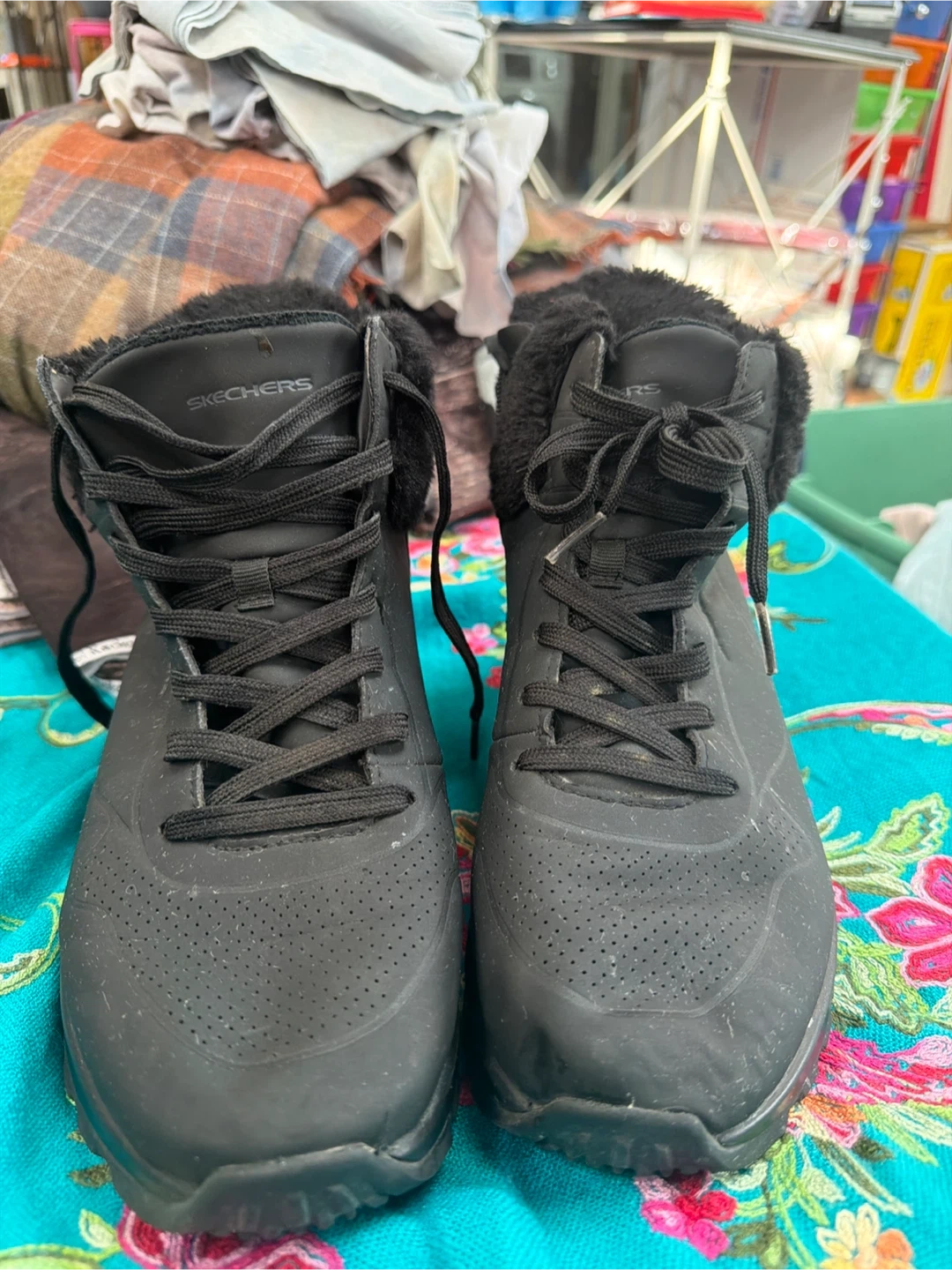 These black Skechers boots are designed for winter wear. They feature a fur lining for warmth and a sturdy sole for traction. Lace-up closure ensures a secure fit.