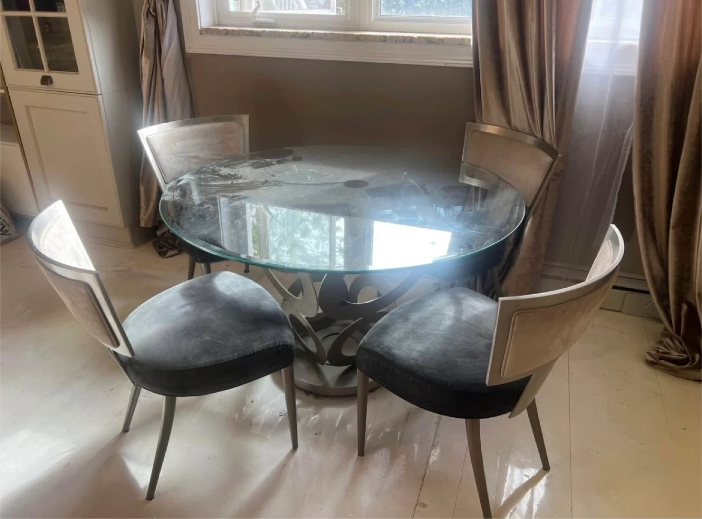 Selling a round glass dining table that comes with four chairs. The table features a unique base design, and the chairs have a sleek, modern look with gray cushioned seats. It's a stylish set for any dining space