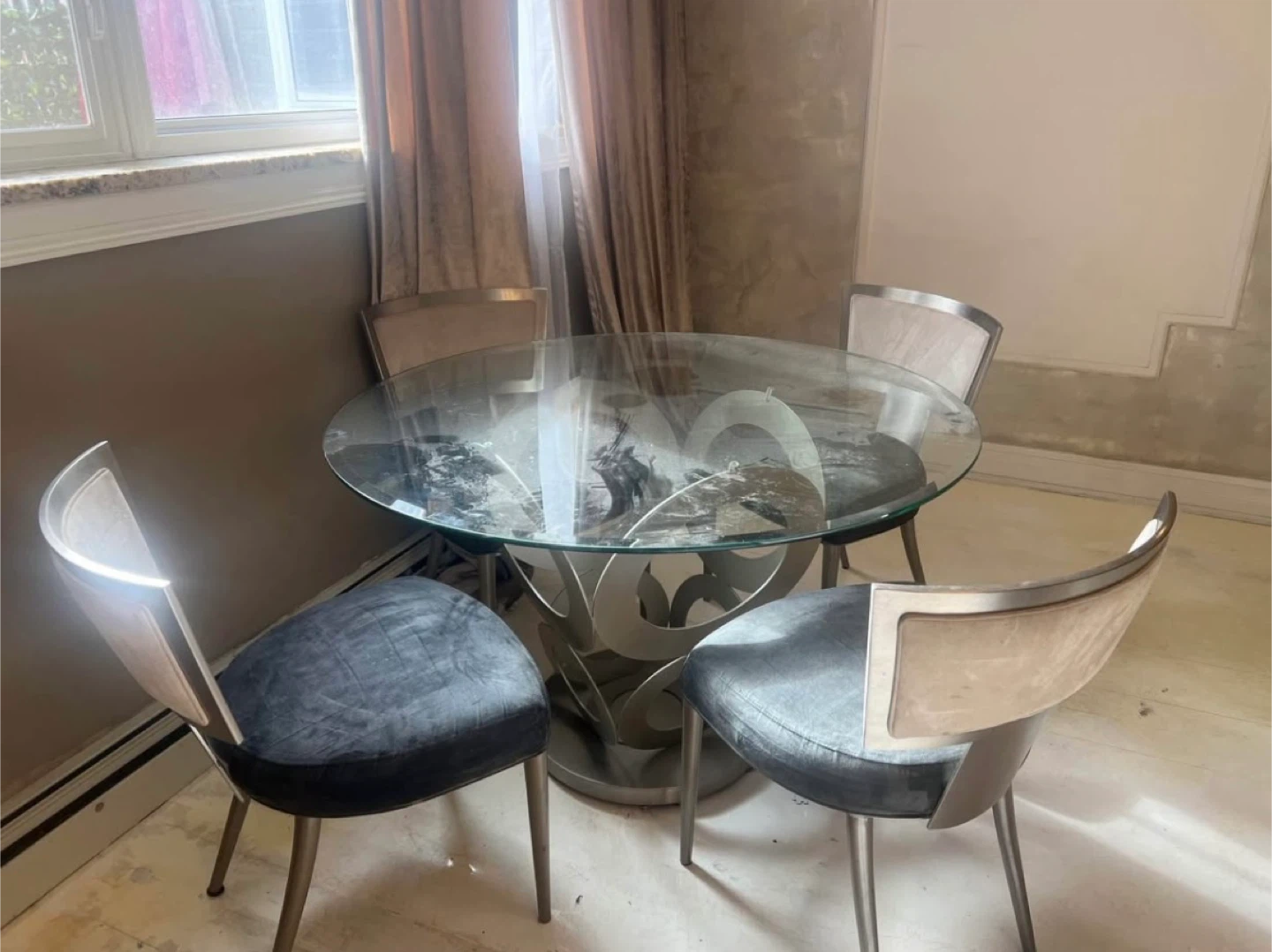 Selling a round glass dining table that comes with four chairs. The table features a unique base design, and the chairs have a sleek, modern look with gray cushioned seats. It's a stylish set for any dining space
