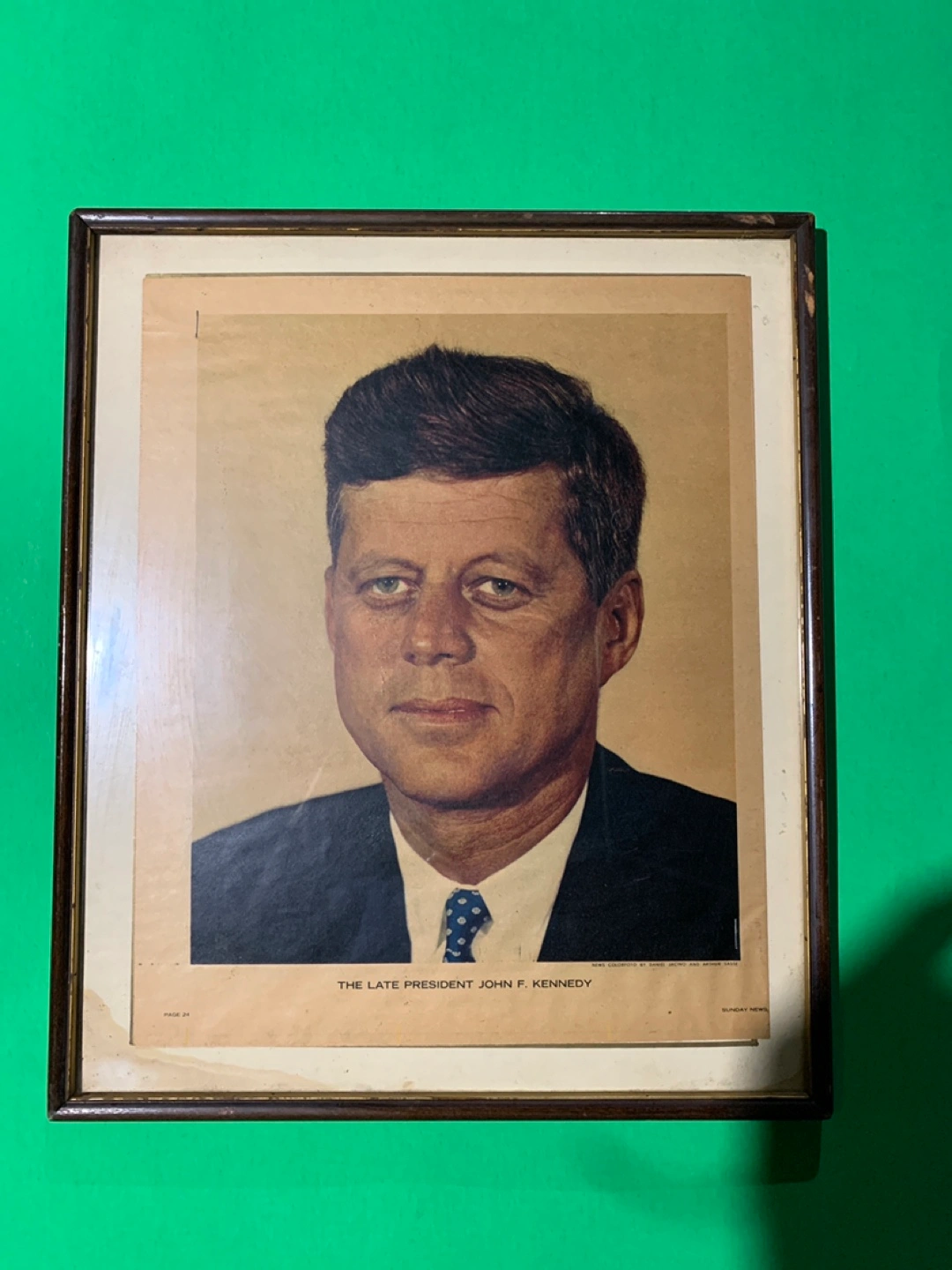 Framed portrait of the late President John F Kennedy. Possibly pulled from a magazine. Marked news colorfoto by Daniel Jacino and Arthur Sasse Framed in brass floral easel frame.