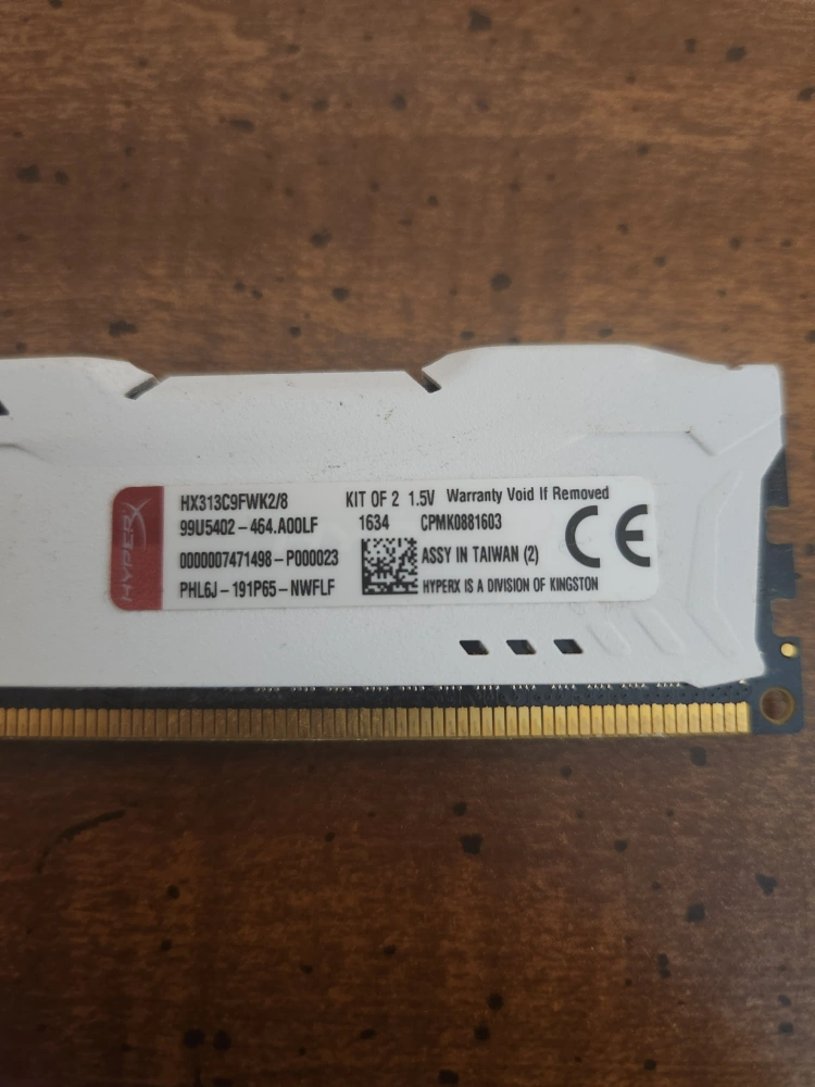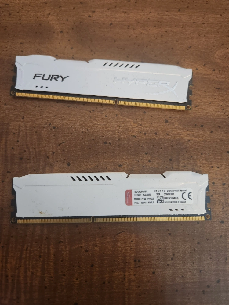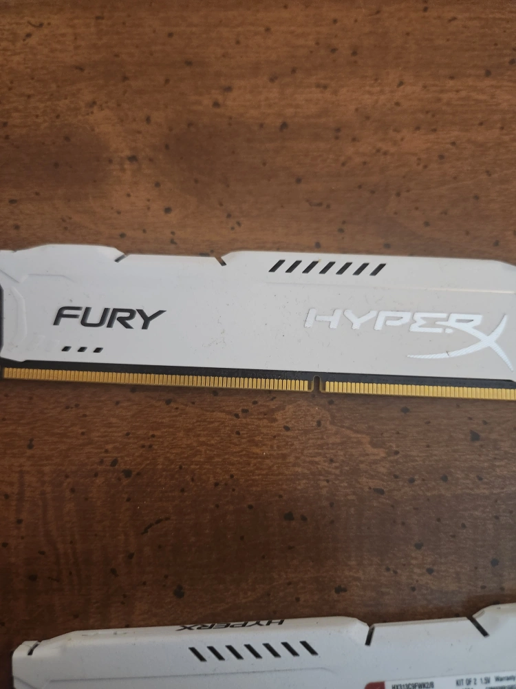 Selling a pair of HyperX Fury DDR3 RAM sticks, each 4GB, for a total of 8GB. They are white in color and in good condition. Model number is HX313C9FWK2/8.