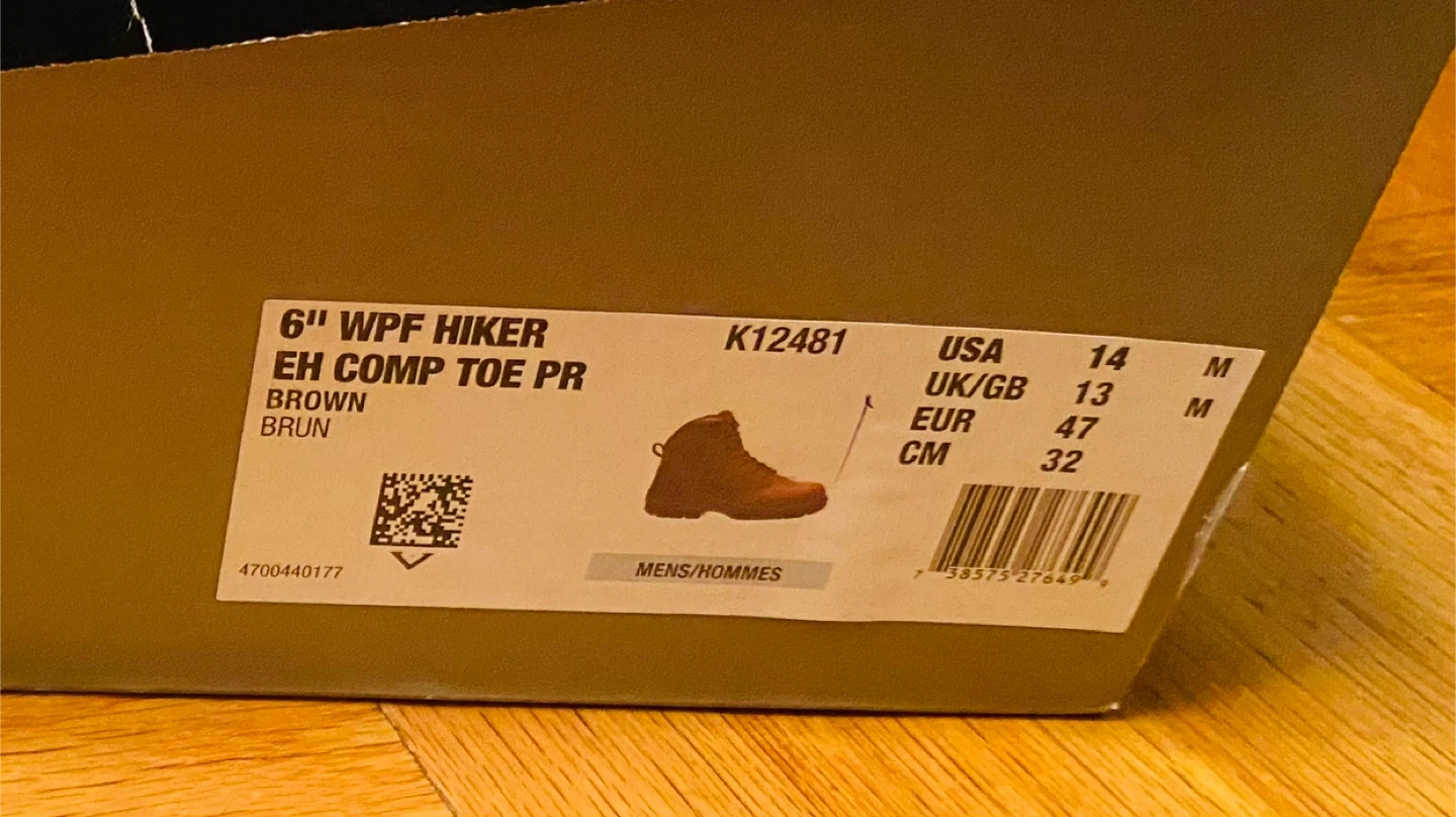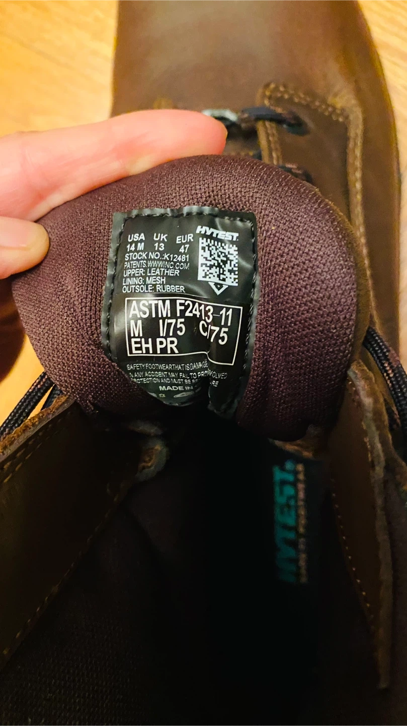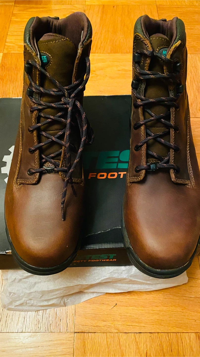 51Selling a pair of HYTEST Apex Waterproof Puncture Resistant Composite Toe 6" Work Boots in brown. They are a US size 14M. These boots feature a waterproof design and composite toe for added protection. They are in good condition and come with the original box