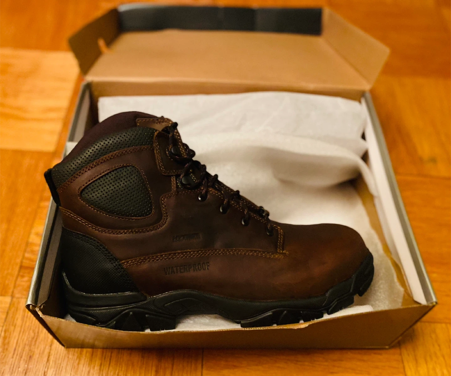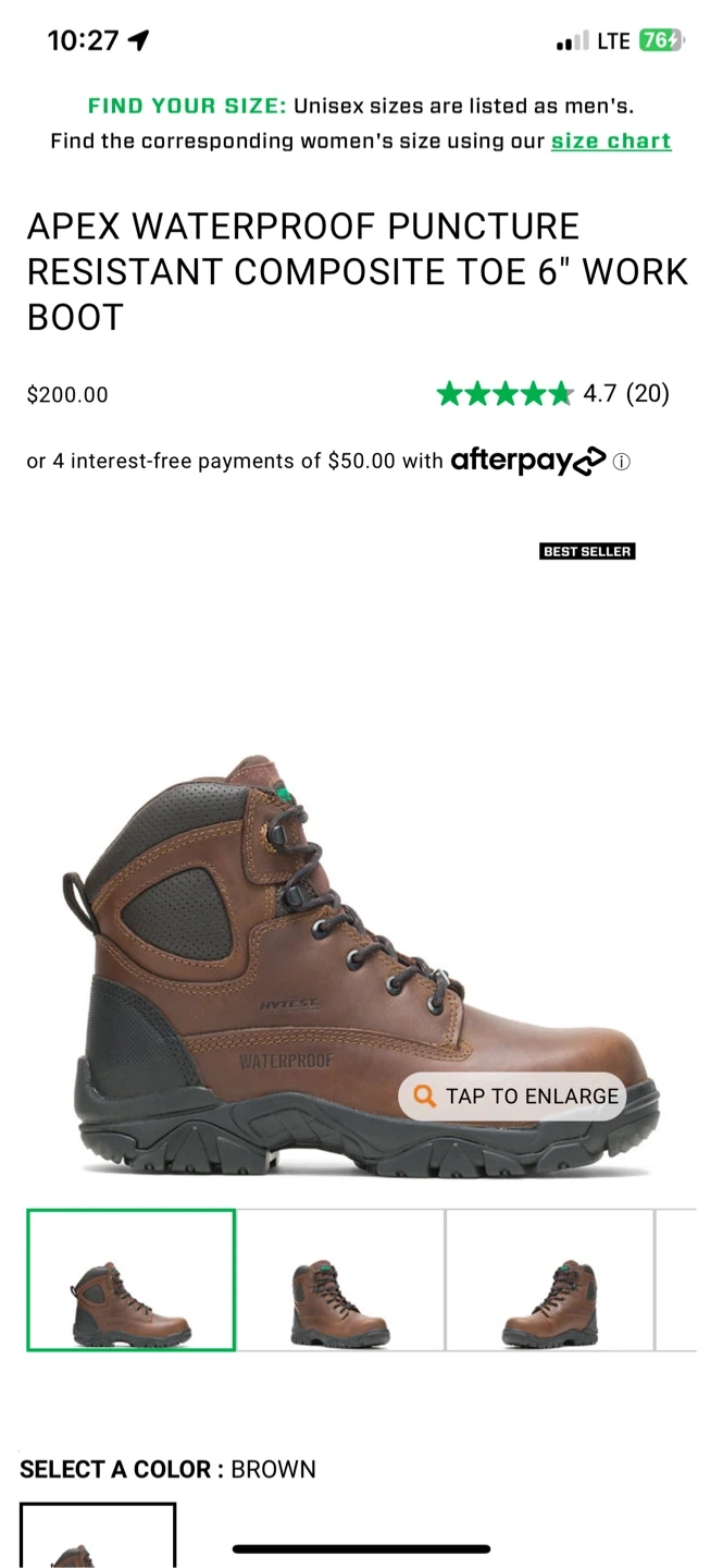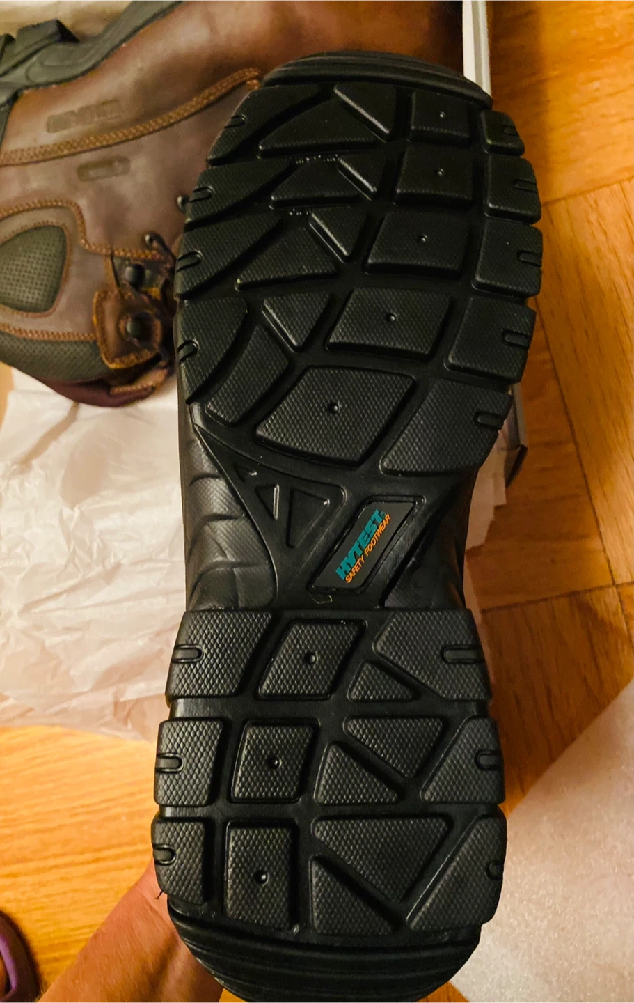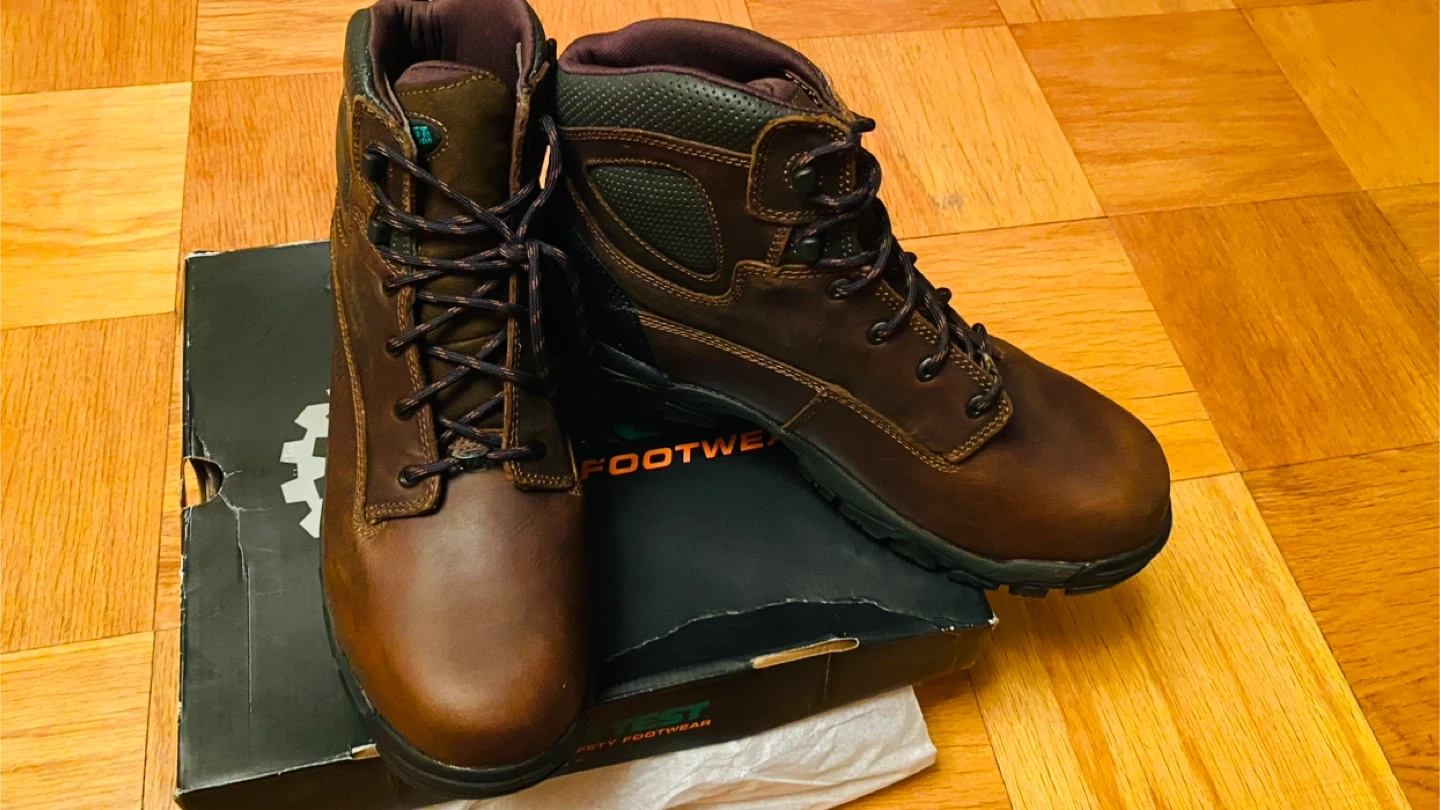 51Selling a pair of HYTEST Apex Waterproof Puncture Resistant Composite Toe 6" Work Boots in brown. They are a US size 14M. These boots feature a waterproof design and composite toe for added protection. They are in good condition and come with the original box