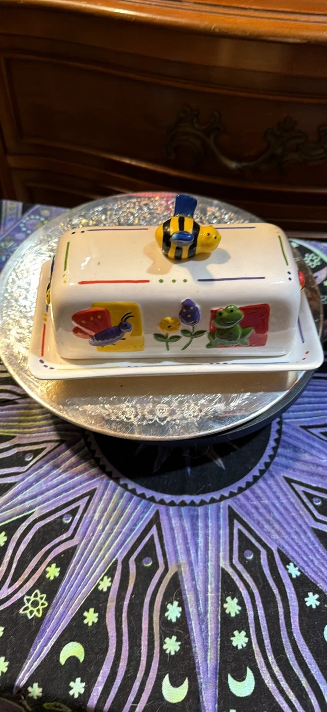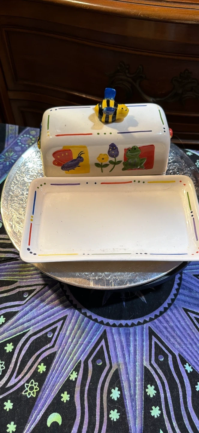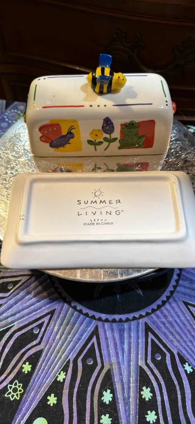 Ceramic butter dish with a cute bee handle. Features colorful illustrations of a butterfly, flowers, and a frog. Dish is made of ceramic and includes a matching base.
