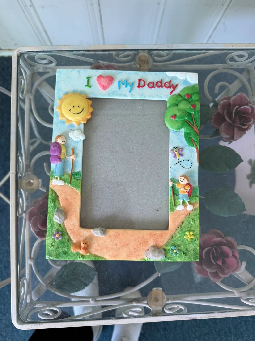 78A cute picture frame that says "I ❤️ My Daddy"! It has a sweet design with a smiling sun, a tree, and little hikers. Perfect for displaying a cherished photo!