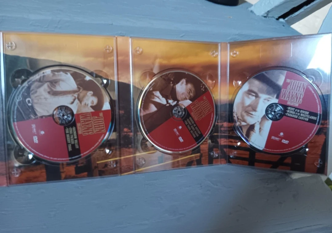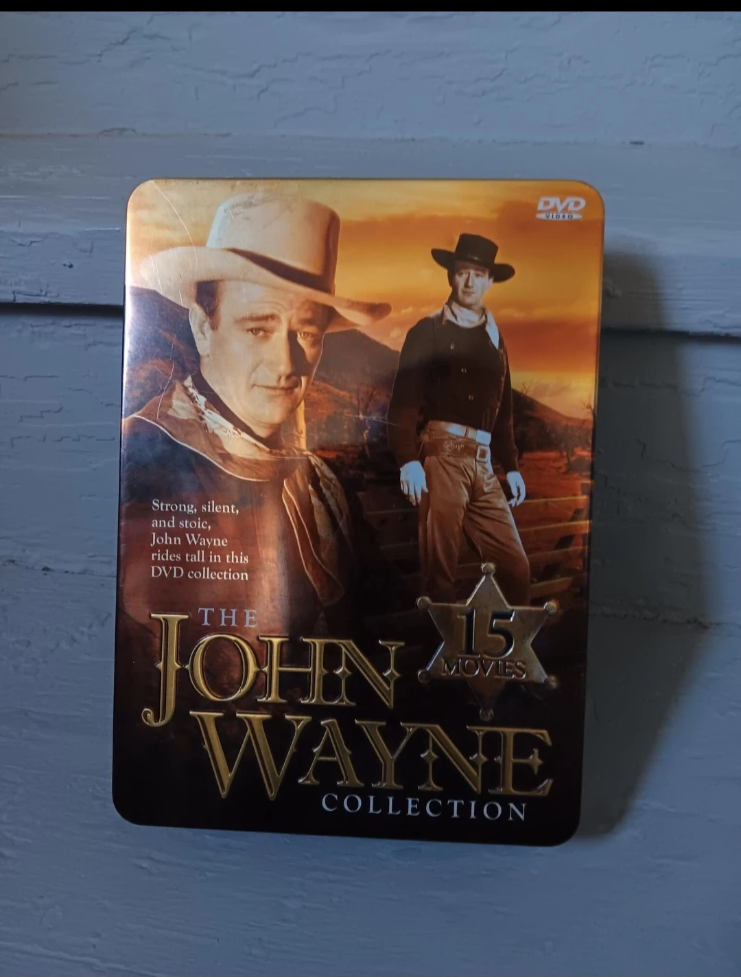 This collector's tin features 15 John Wayne movies. It includes a deluxe booklet with John Wayne's filmography. The set contains 5 DVDs with Western films.