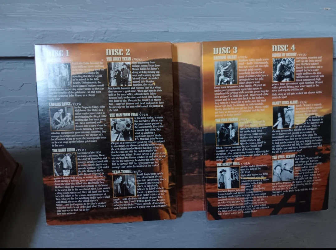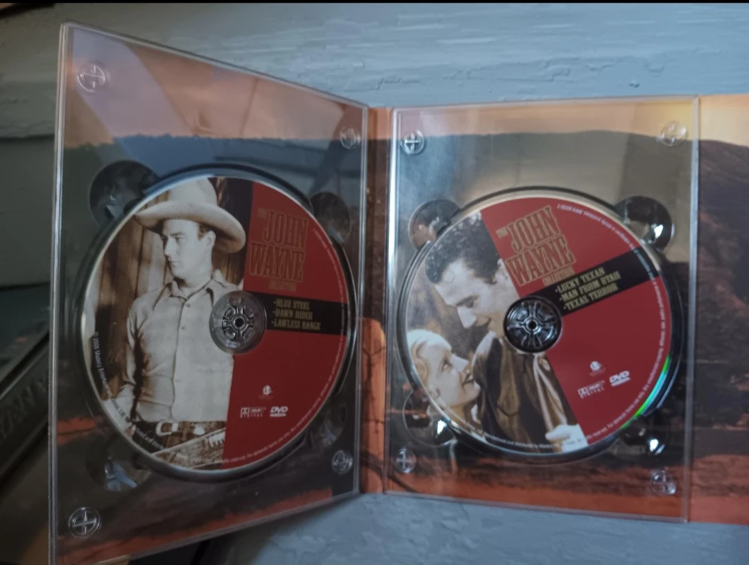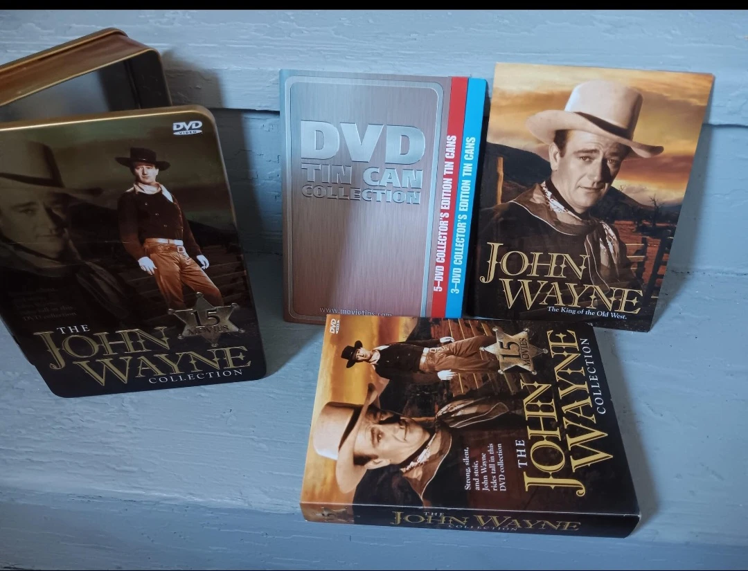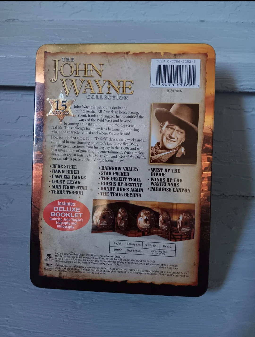 This collector's tin features 15 John Wayne movies. It includes a deluxe booklet with John Wayne's filmography. The set contains 5 DVDs with Western films.