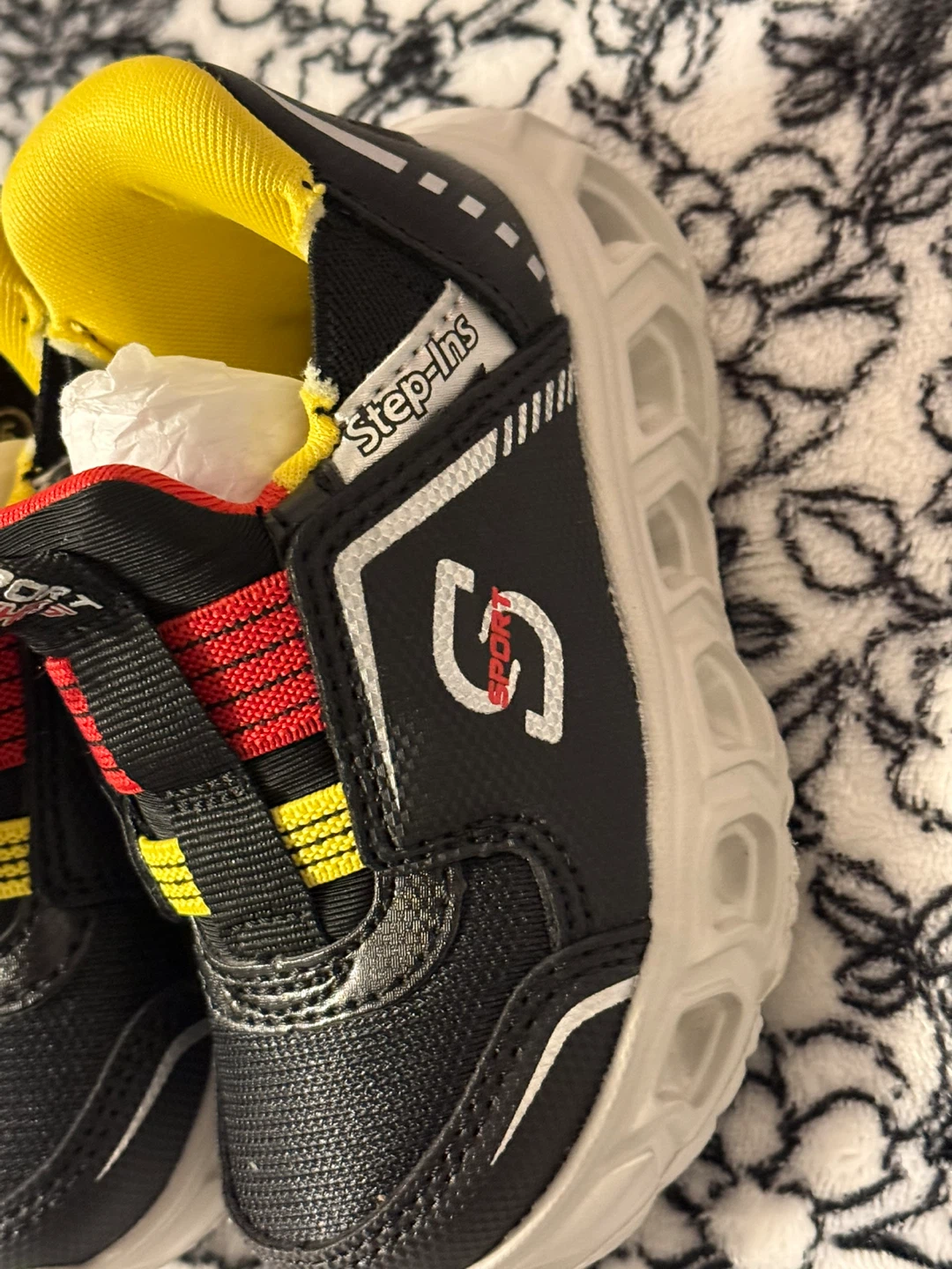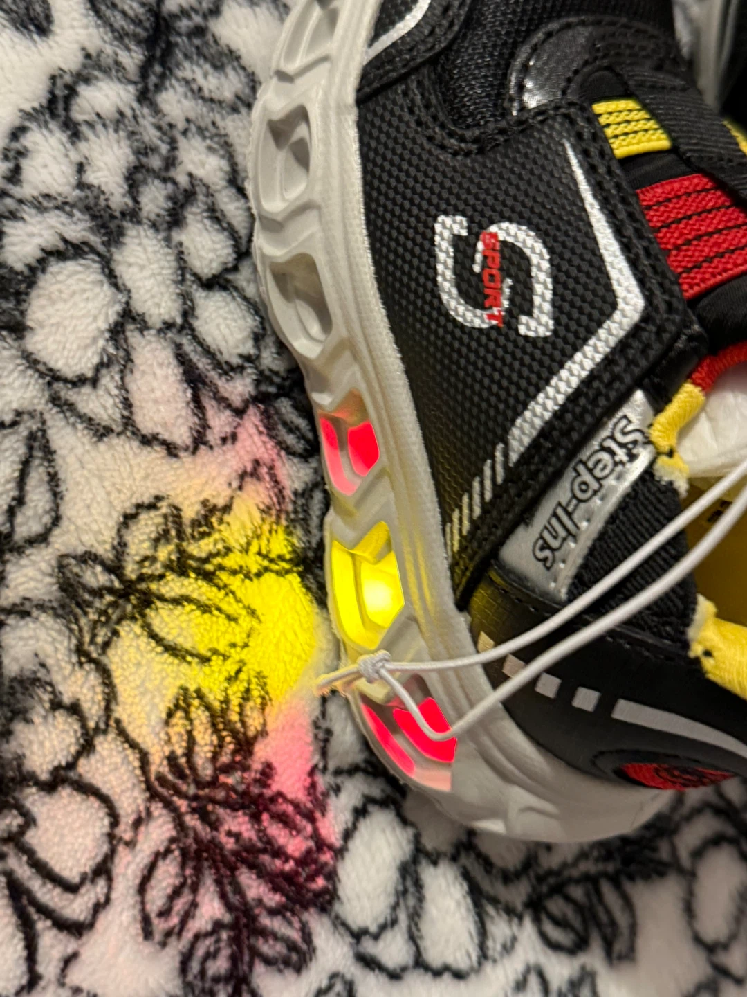 These black "Step-Ins" sneakers for children feature colorful light-up accents on the soles. They have a convenient hook-and-loop closure for easy on and off. The mesh and synthetic upper provides comfort and durability. Perfect for active kids who love fun footwear!
