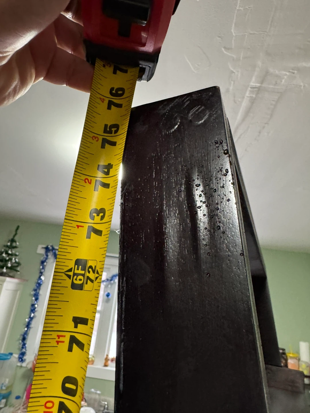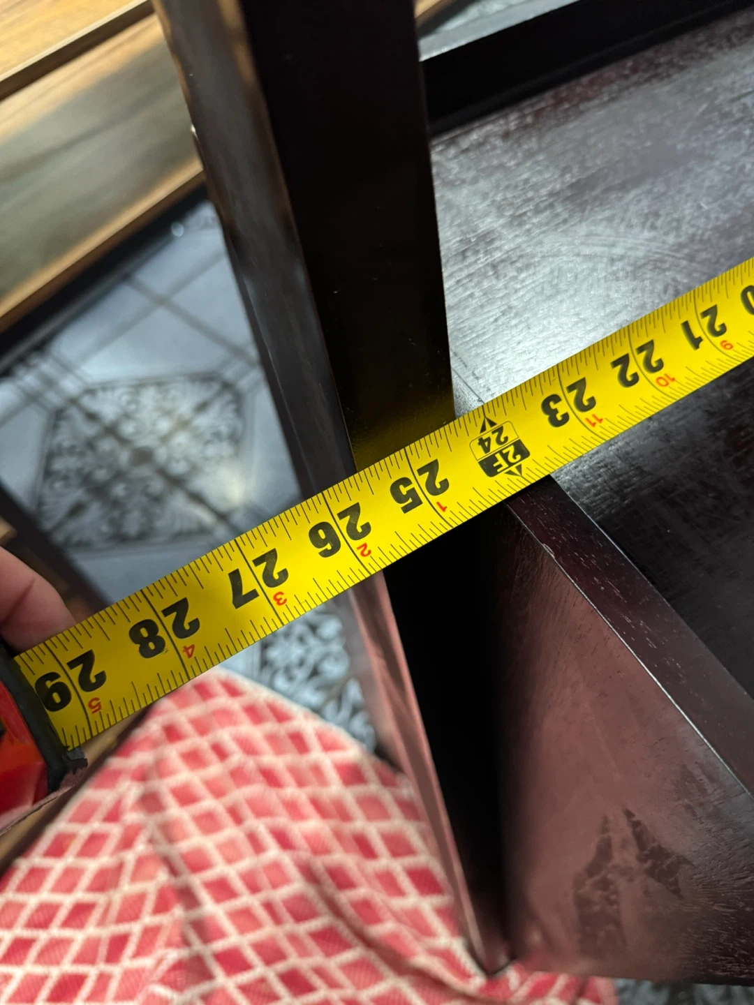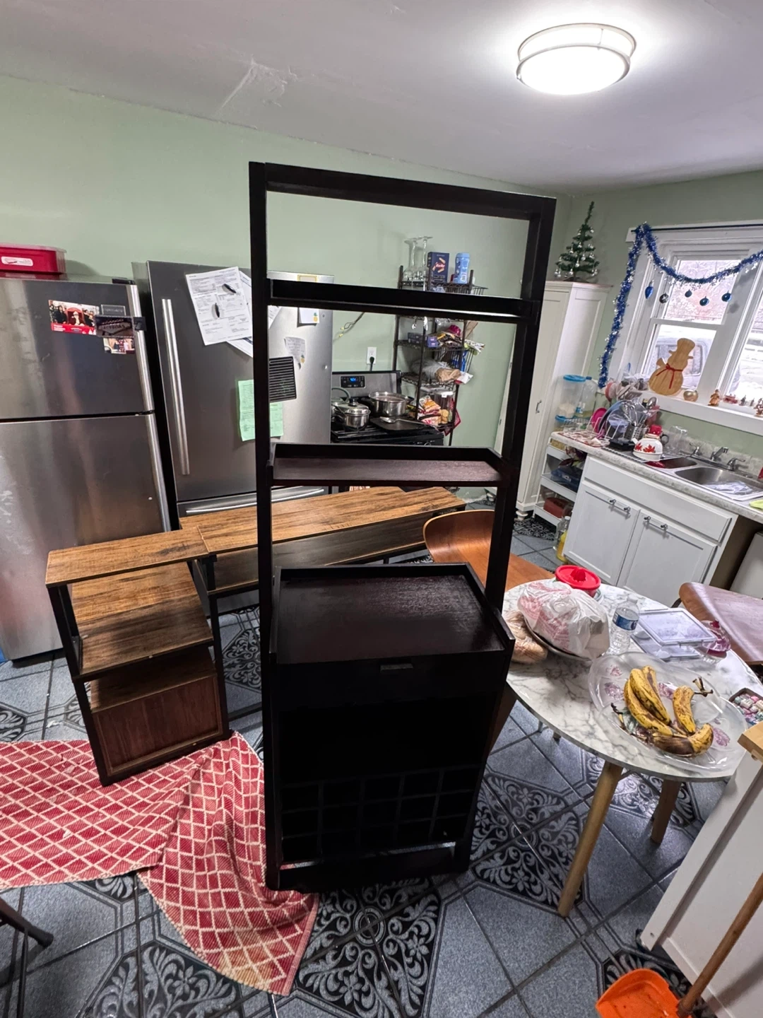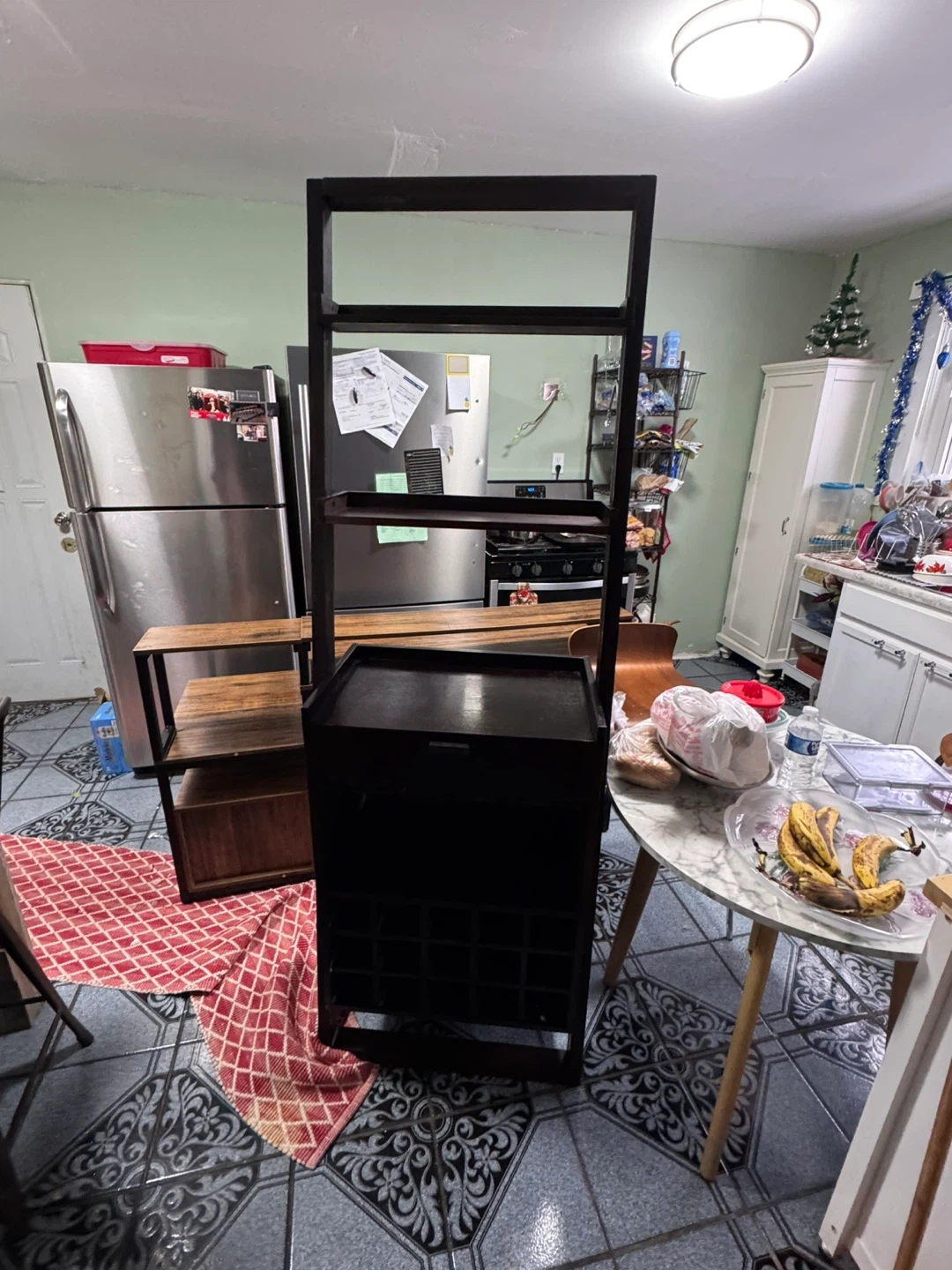 Selling a dark brown wooden shelving unit. It measures approximately 72 inches in height, 28 inches in width, and 15 inches in depth. It has multiple shelves and a wine rack at the bottom
