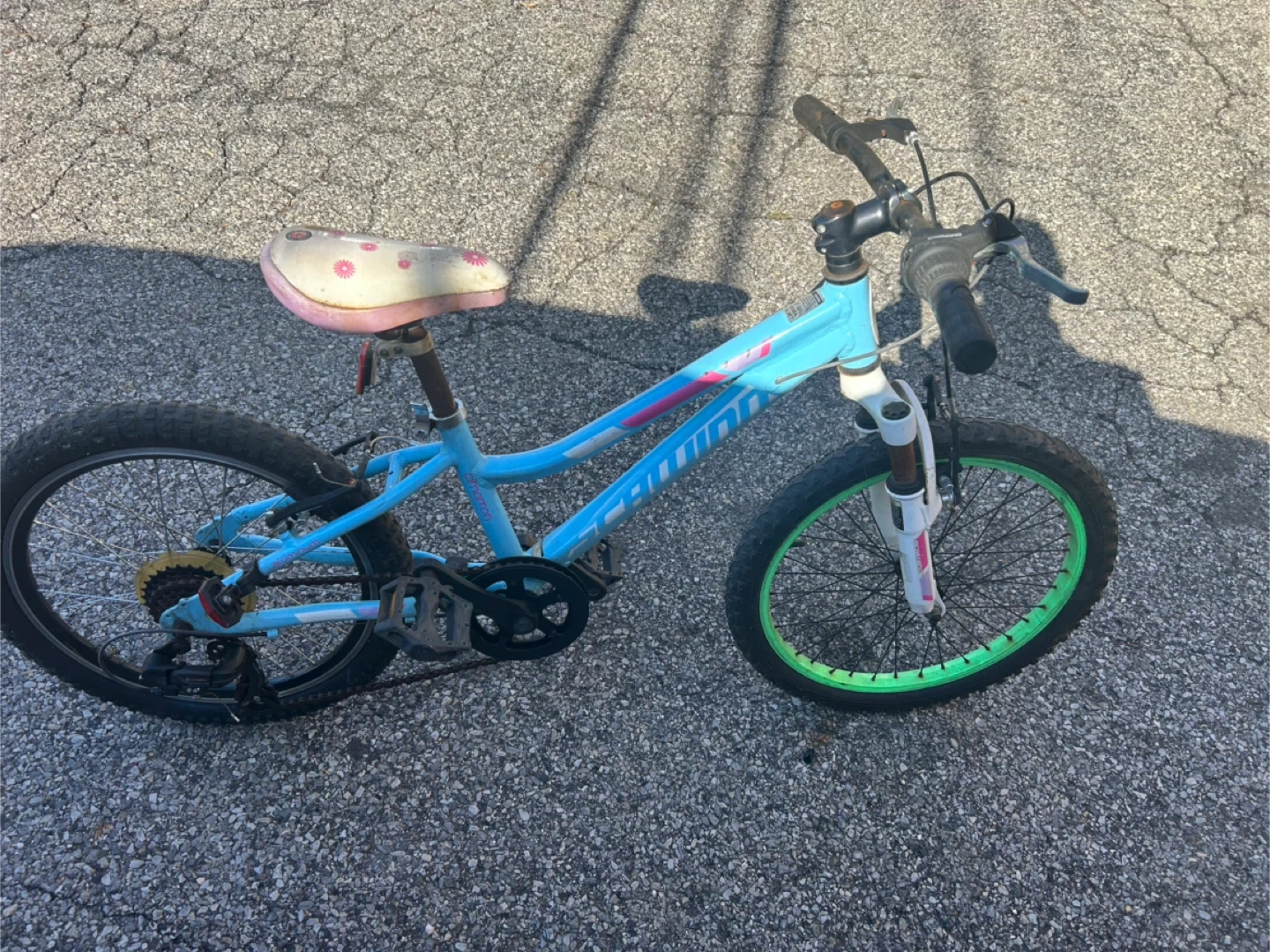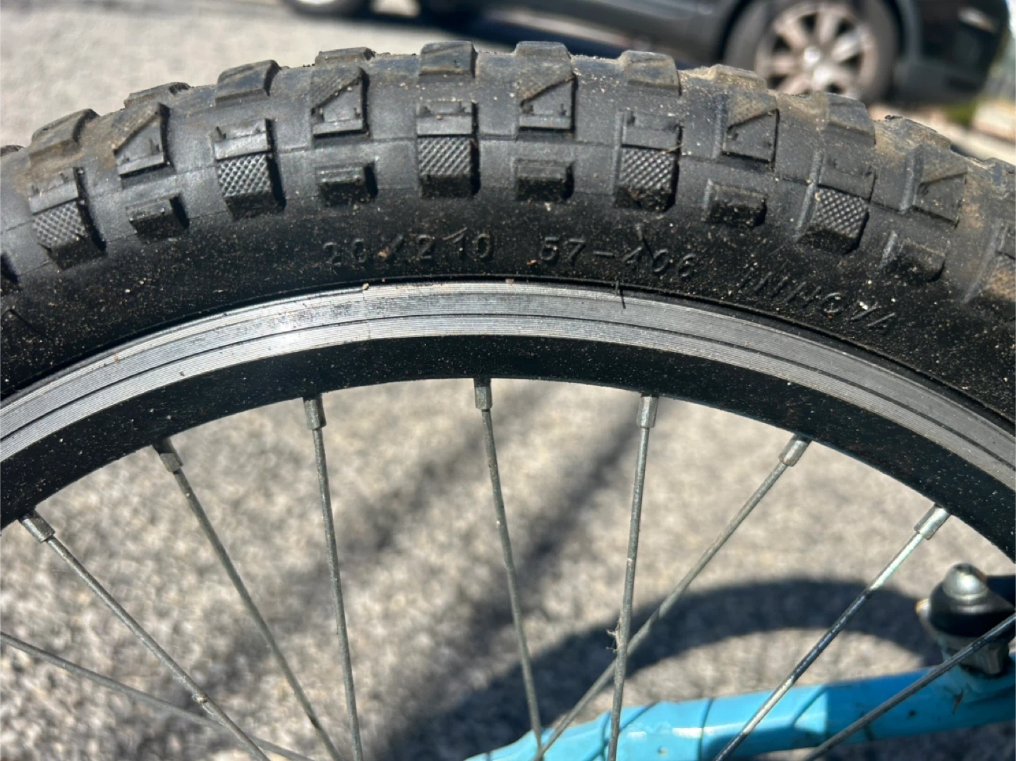 Girl's Schwinn 20-inch bike with a light blue frame and pink and white seat. The tires are marked as 20 x 2.10 57-406. It's in used condition, ready for a new rider!