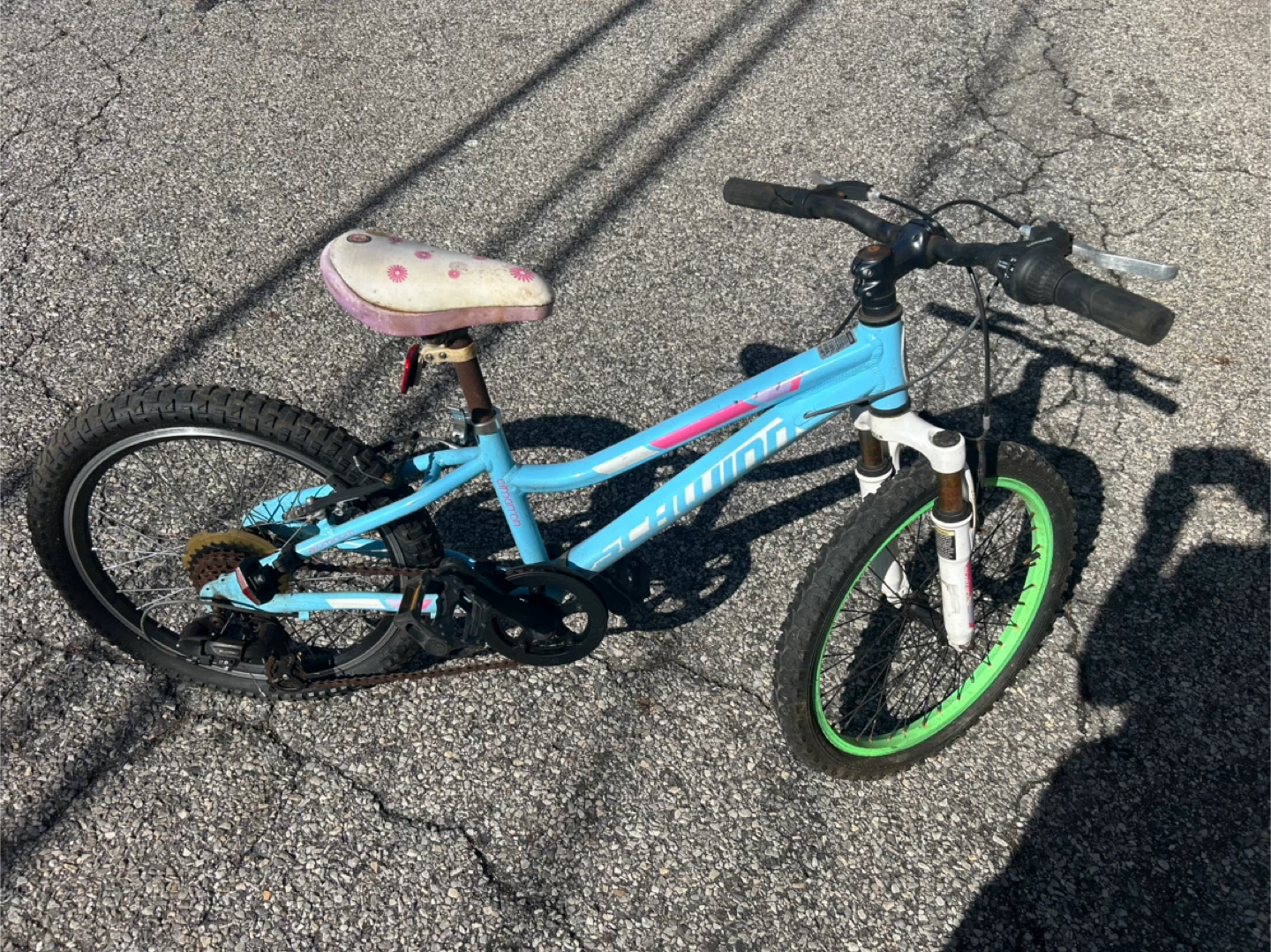 Girl's Schwinn 20-inch bike with a light blue frame and pink and white seat. The tires are marked as 20 x 2.10 57-406. It's in used condition, ready for a new rider!