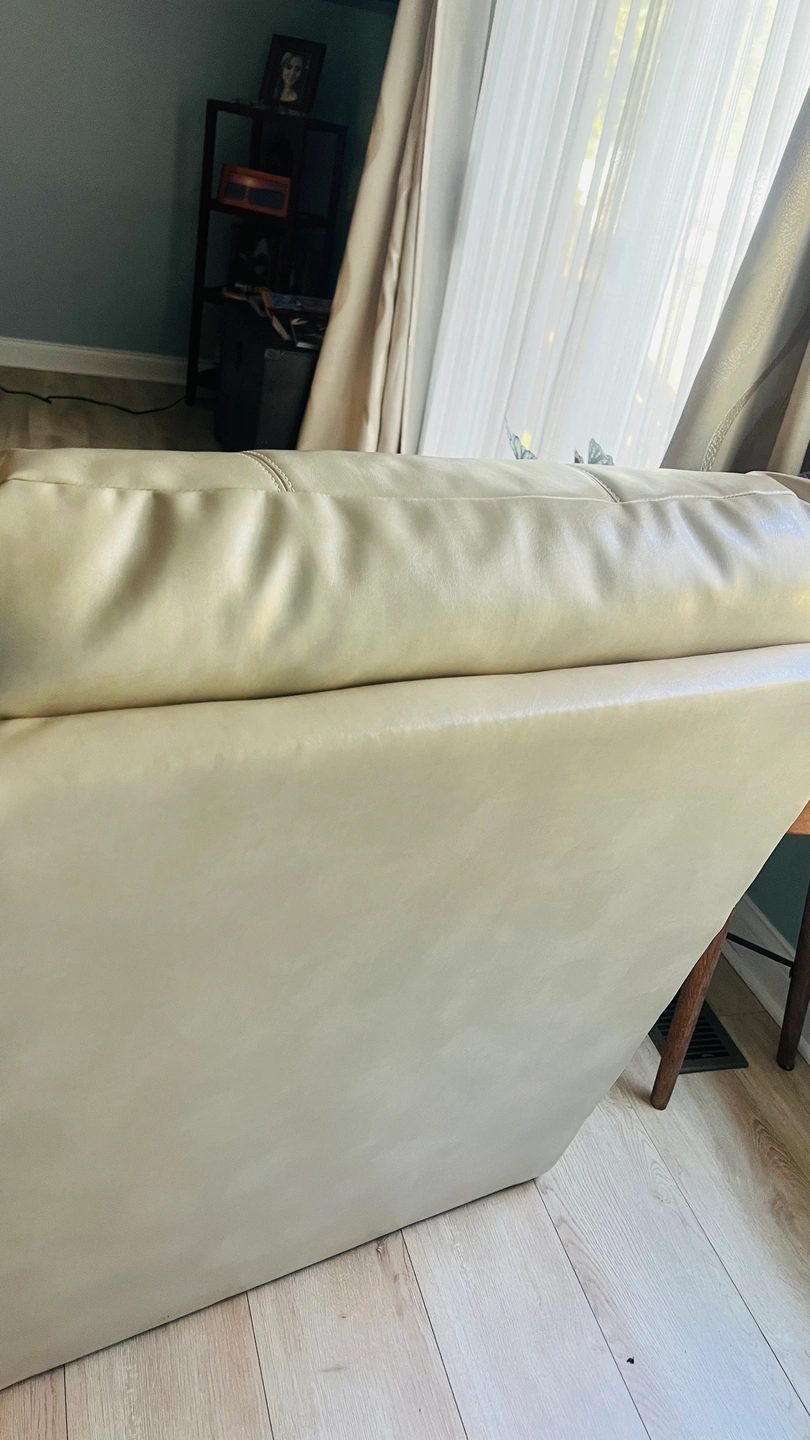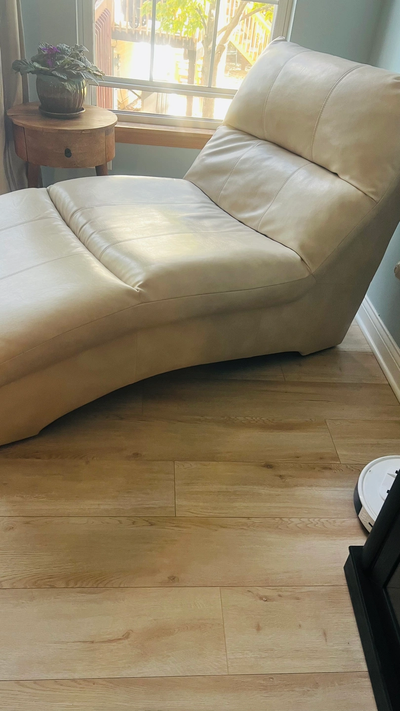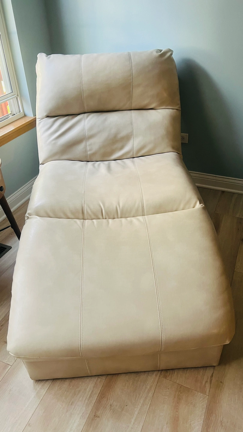 This lounge has a comfortable, curved design that is perfect for relaxing. It is made from a soft, faux leather and features a built-in headrest. This lounge is in great condition.