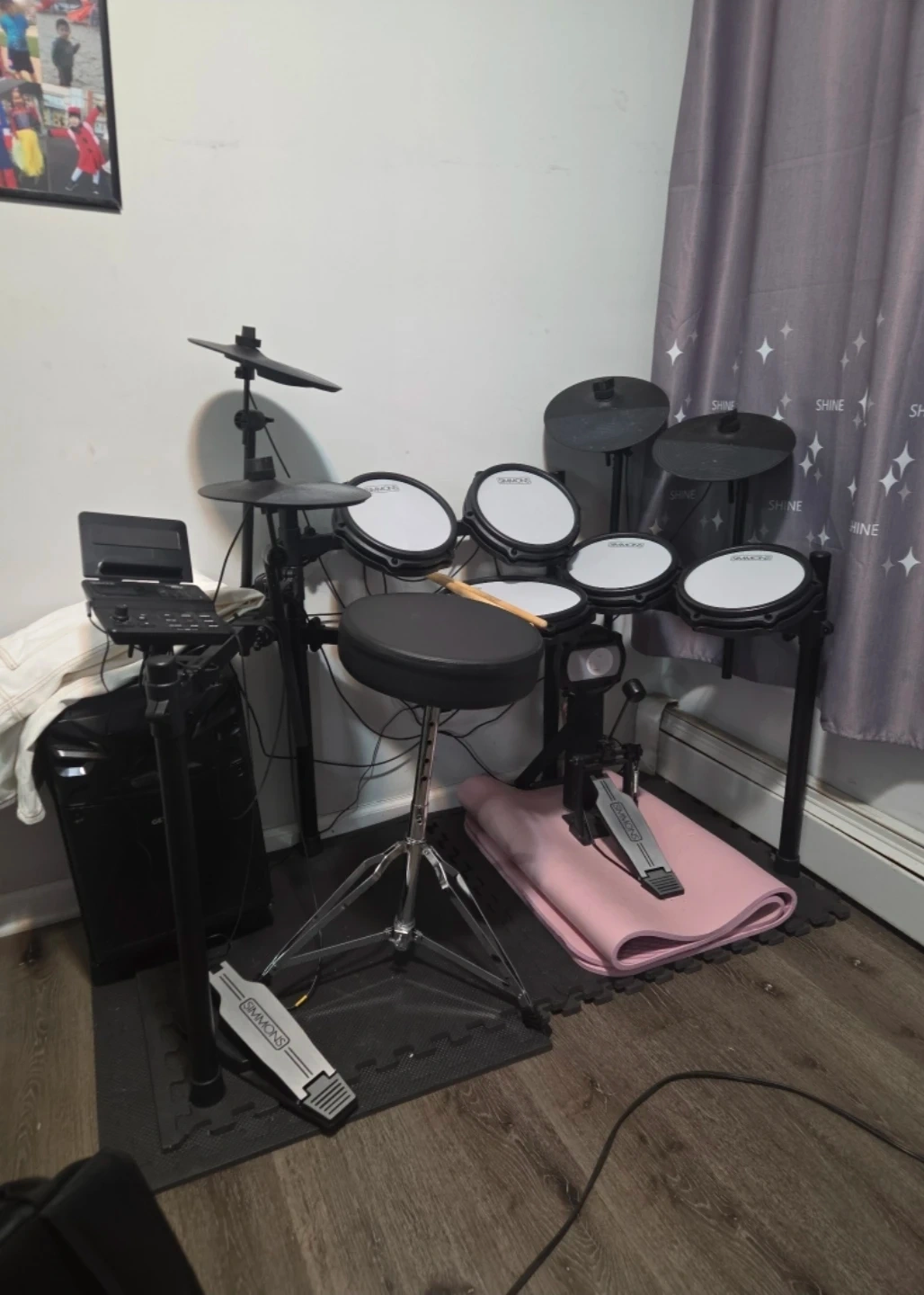 Practically new everything works amazingly. I moved houses now im renting and the foot pedal sends too mucb vibrations through the floor my neighbors killing me INPERSON ONLY NO SHIPPING I have no instructions manual so I will not dissemble it. Drum stool and sticks included firm price