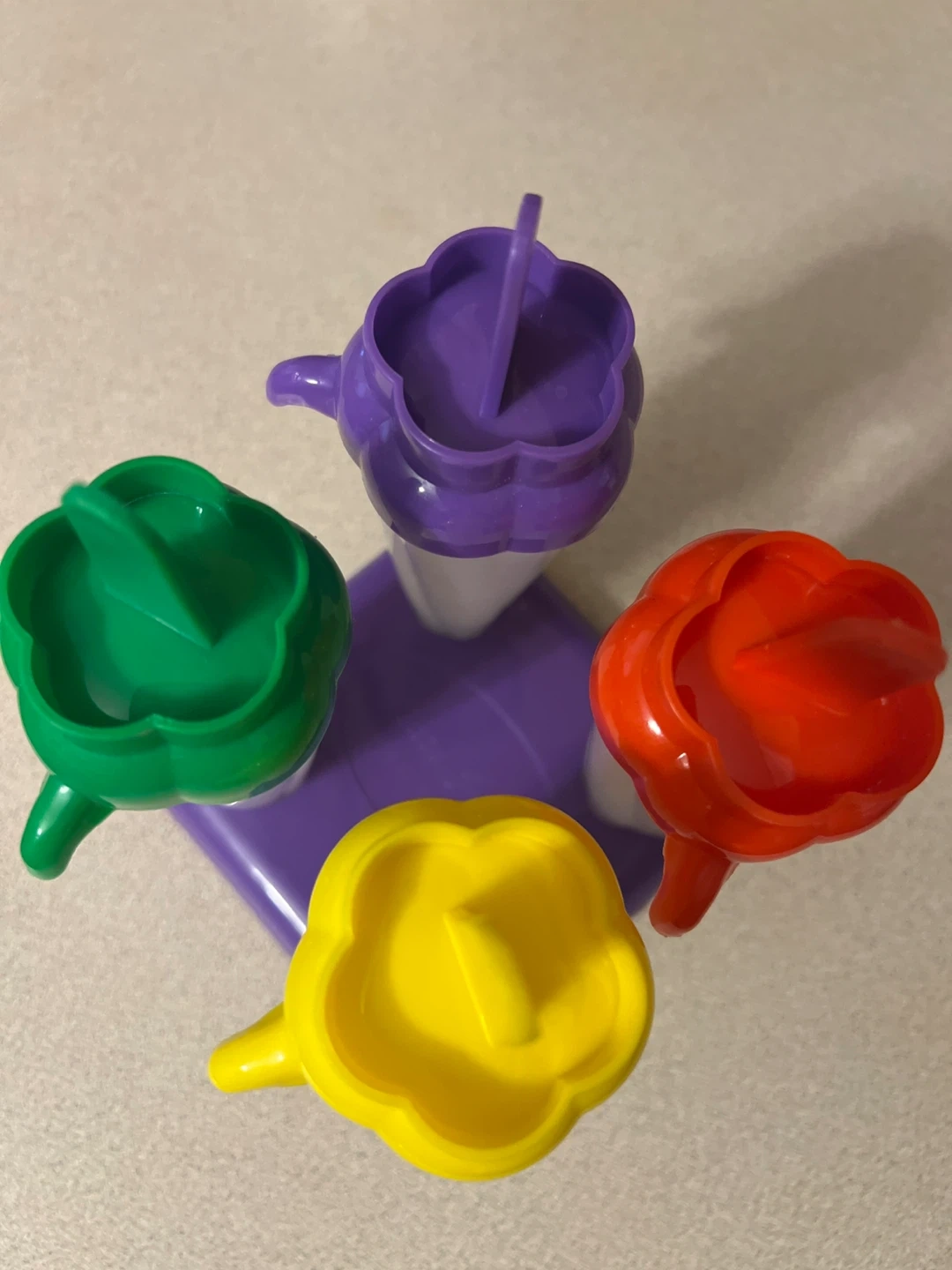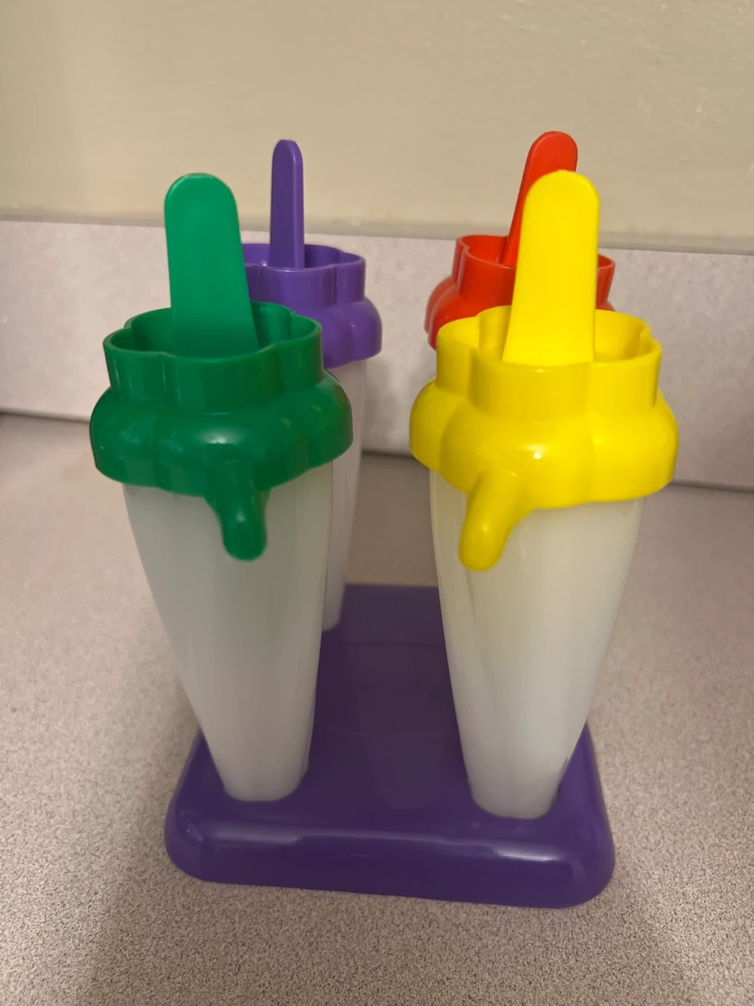 These are four ice pop molds in assorted colors: green, purple, red, and yellow. Each mold has a white base and a colorful top with a handle. They come attached to a purple base for easy storage and freezing. Never used.