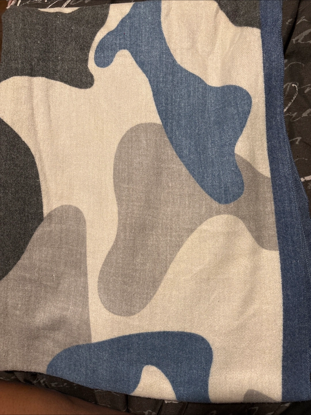 Soft throw blanket. Features an abstract camouflage pattern in shades of gray, blue, and white. Perfect for adding a touch of style to your home decor.