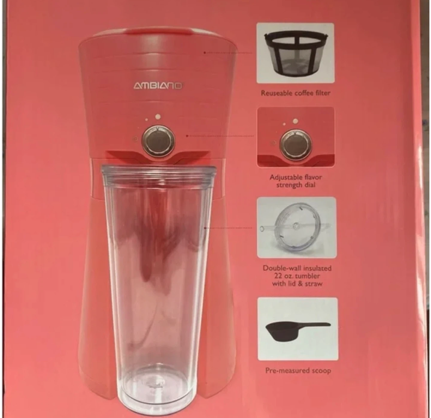 New ---- Single serve coffee maker in coral pink. It comes with a reusable coffee filter, adjustable flavor strength dial, and a double-wall insulated 22 oz. tumbler with lid and straw. Includes a pre-measured scoop. Brews a single cup of coffee.