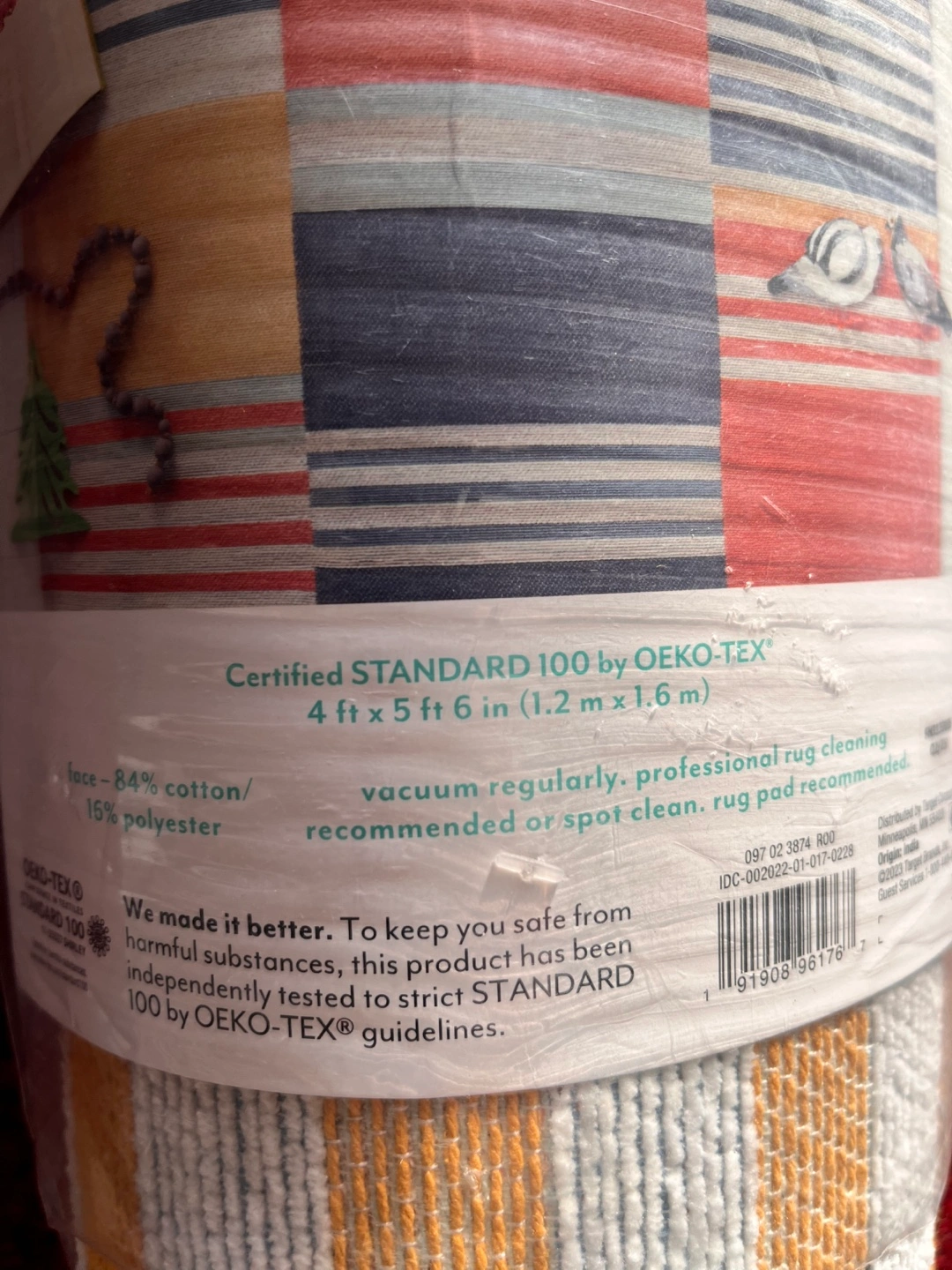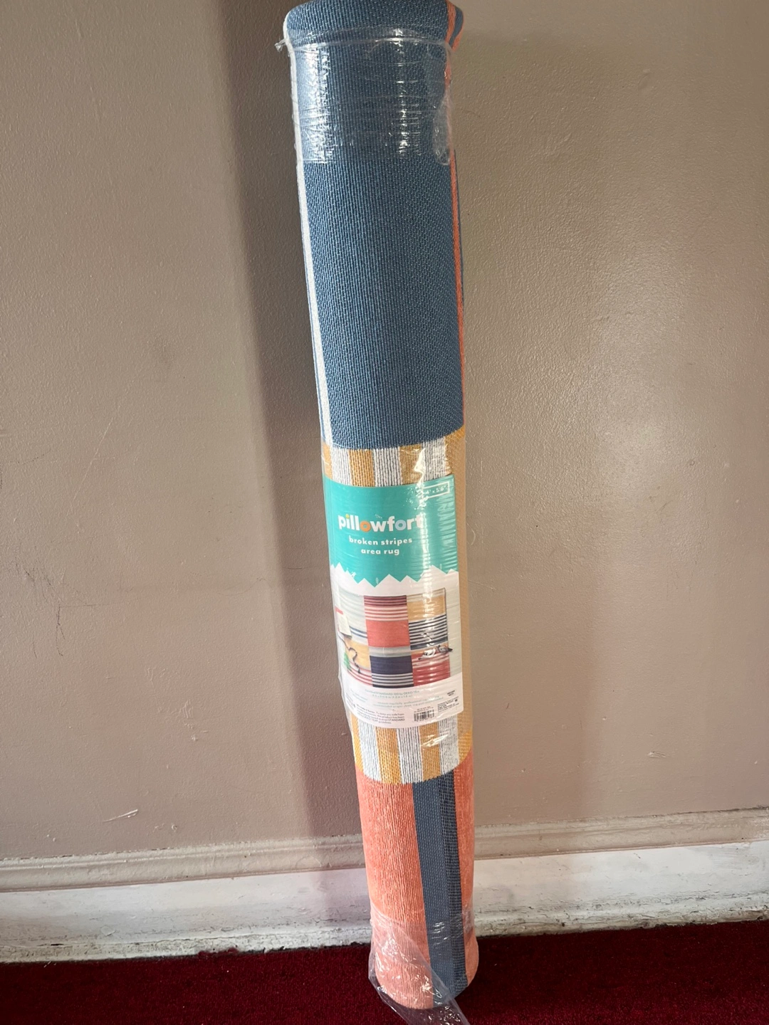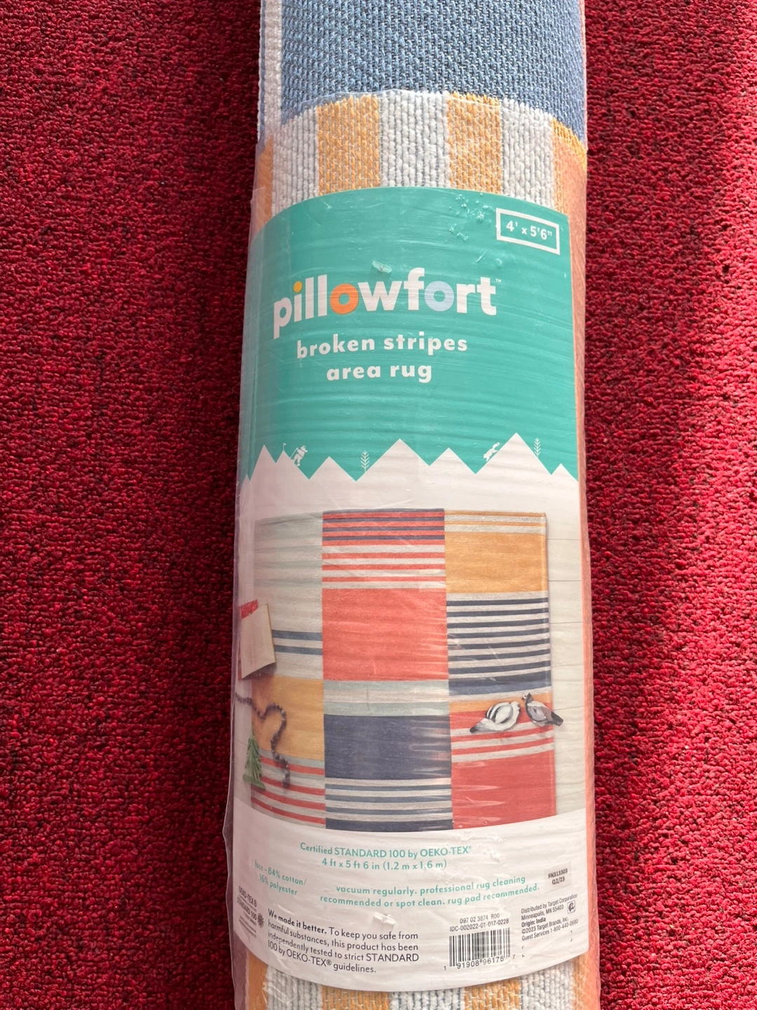 New Pillowfort area rug. Multicolored stripes. 4ft x 5ft 6in. 84% cotton/16% polyester. Machine washable. Oeko-Tex Standard 100 certified.
