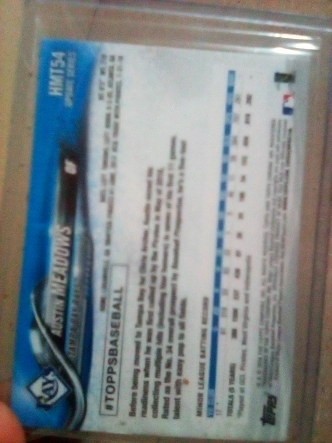 This is a 2019 Topps Chrome Austin Meadows baseball card for the Tampa Bay Rays. It's #HMT54 in the Sport Series. The card details his minor league batting record.