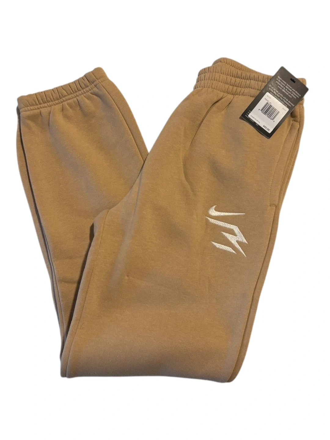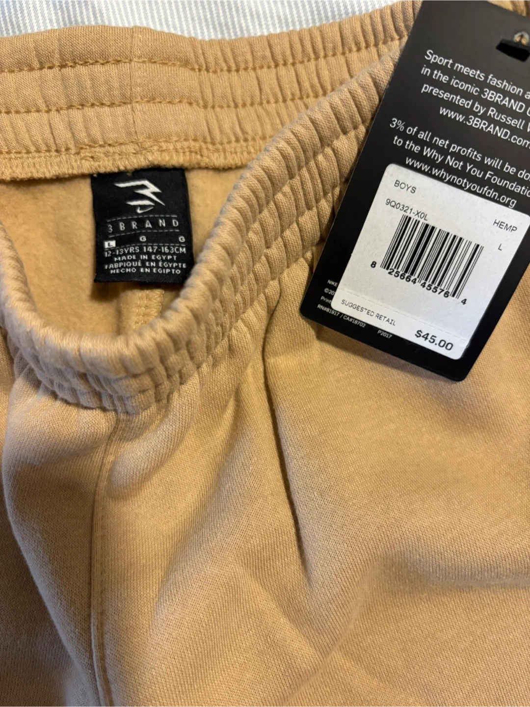 These are 3BRAND boys' jogger sweatpants. They're a size large in a tan color. Made in Egypt. Cotton blend material.